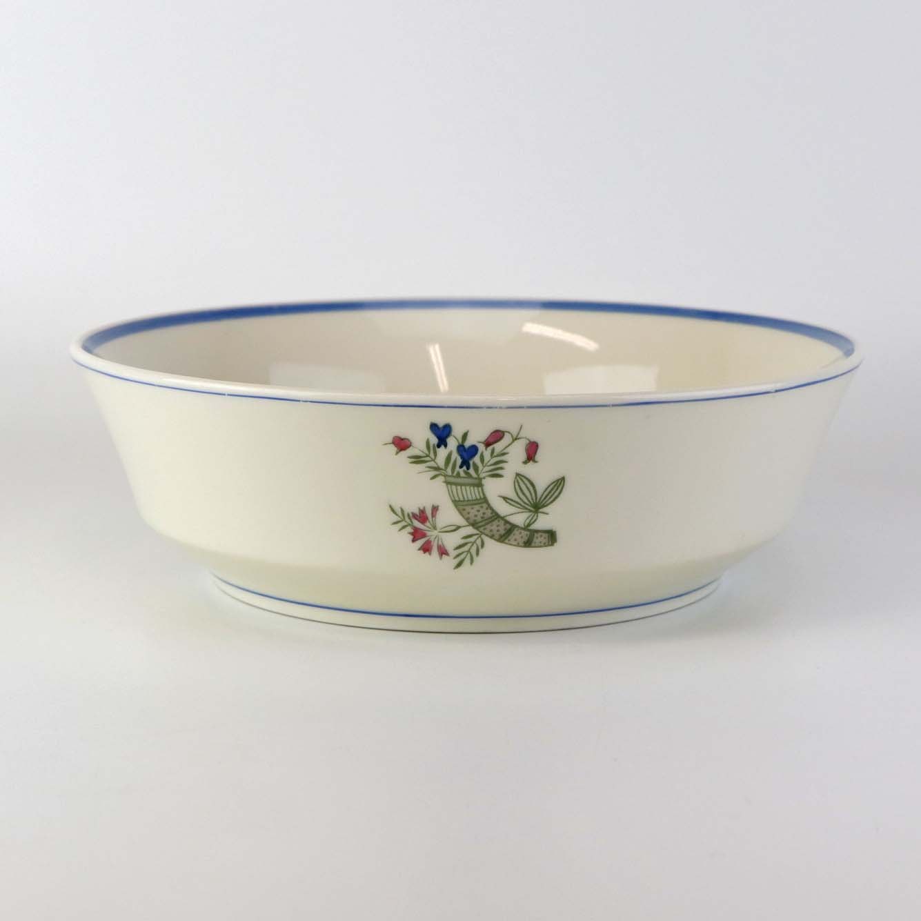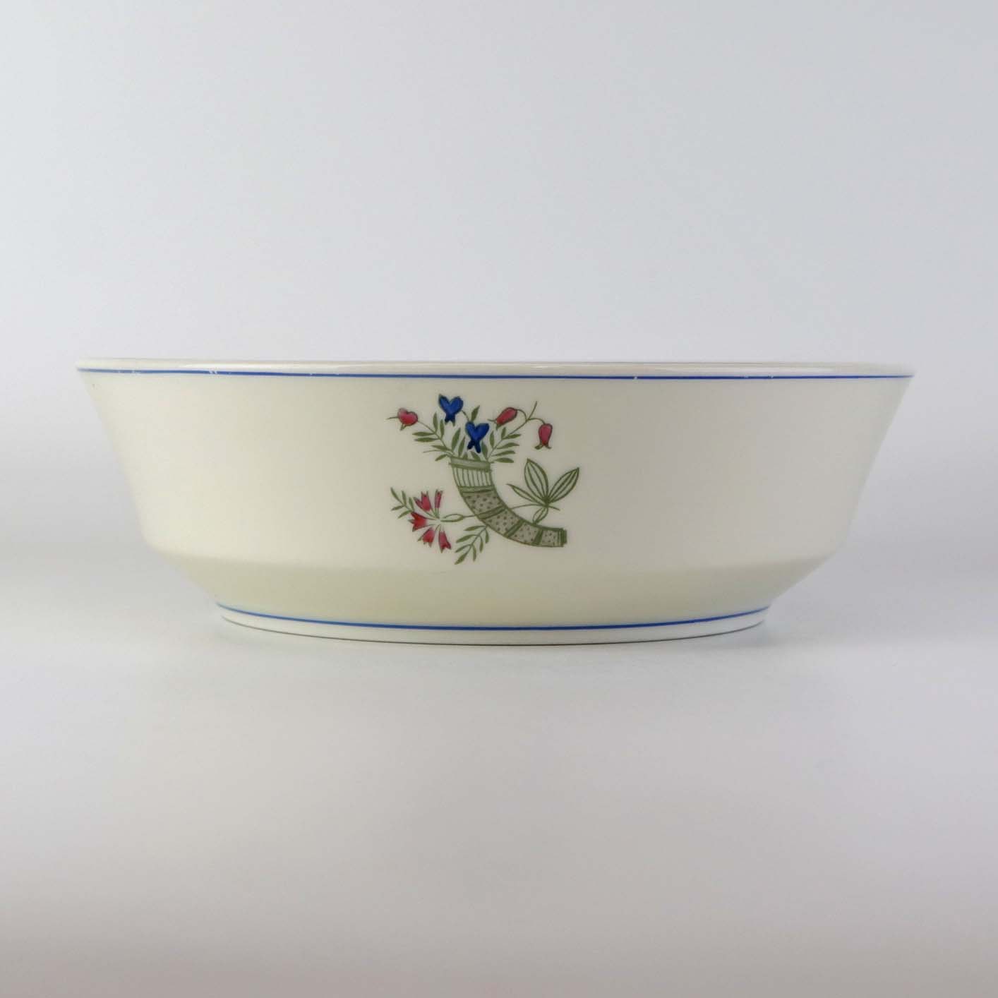 Service i glat lyst porcelæn med blå kantstreg og dekoration med horn samt blå og røde blomster.