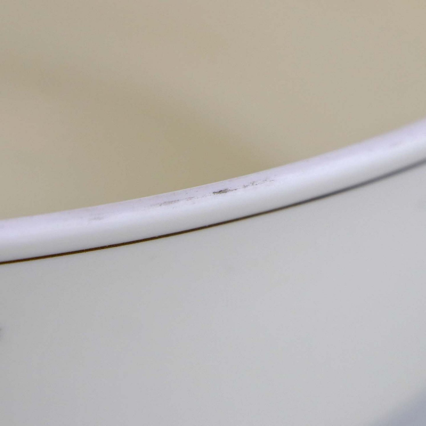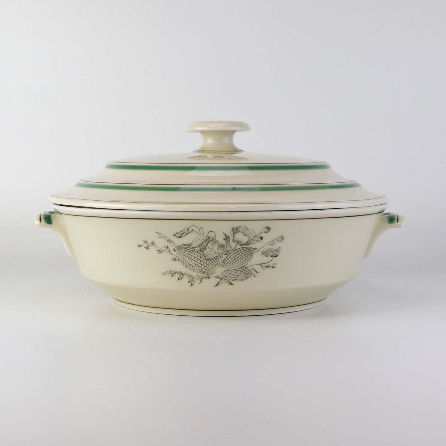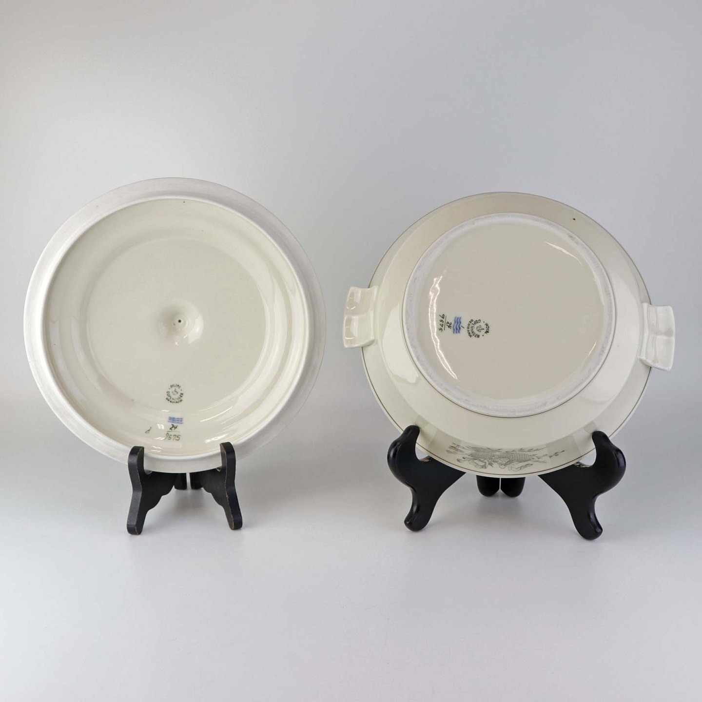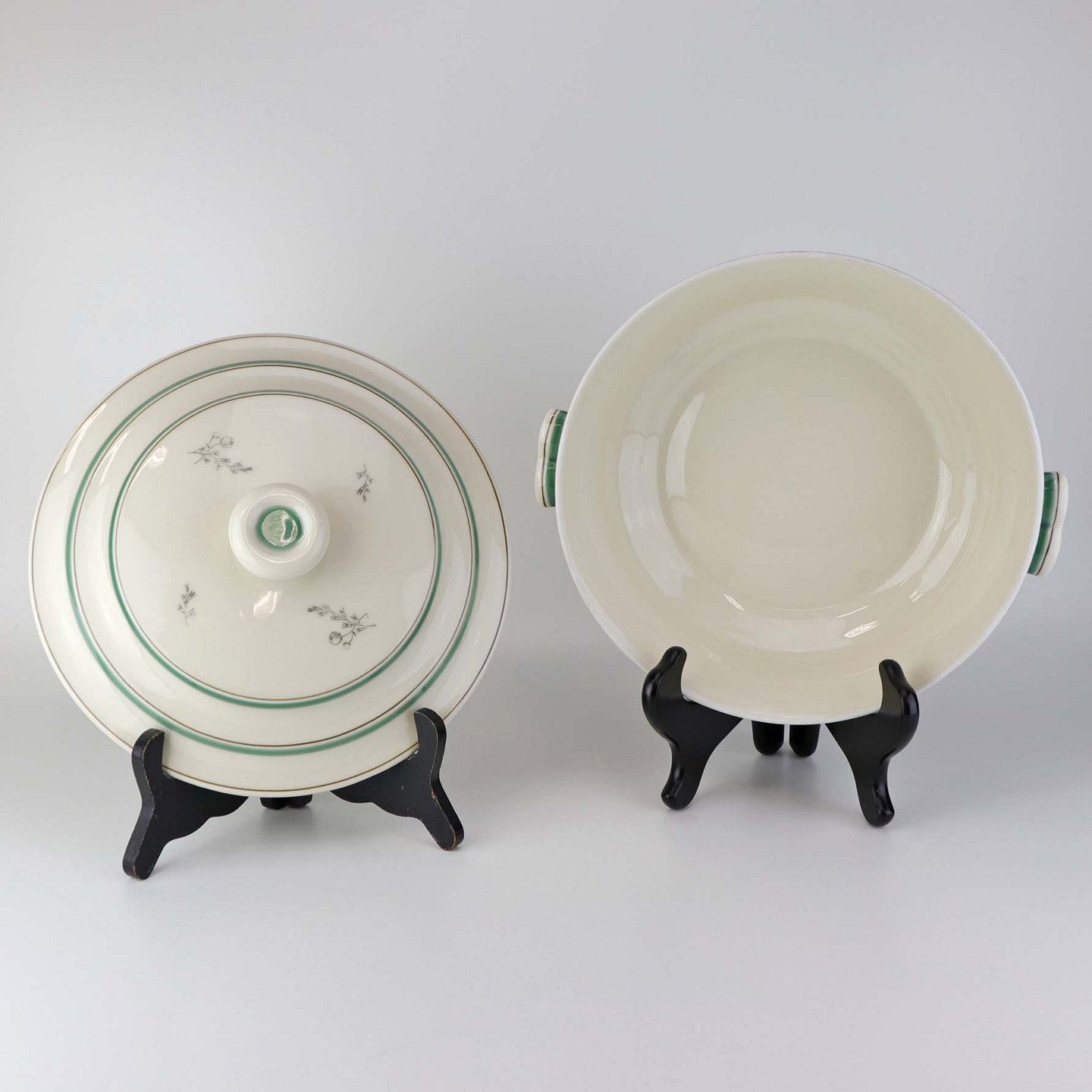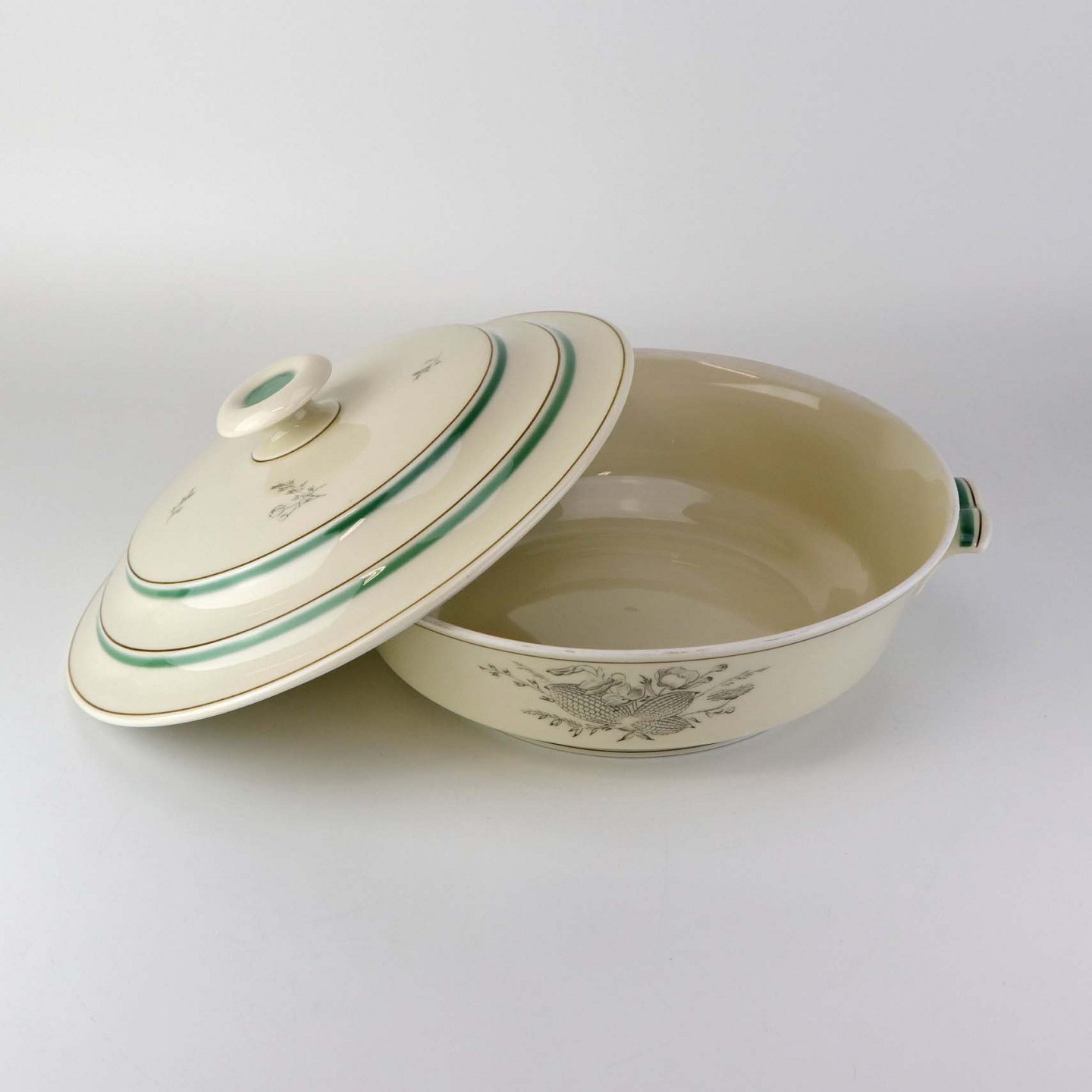 Fremstår med mindre ujævnhed i porcelæn på låget, brugsspor på skålens topkanten samt brun plet under glasuren under bunden af lågfadet.