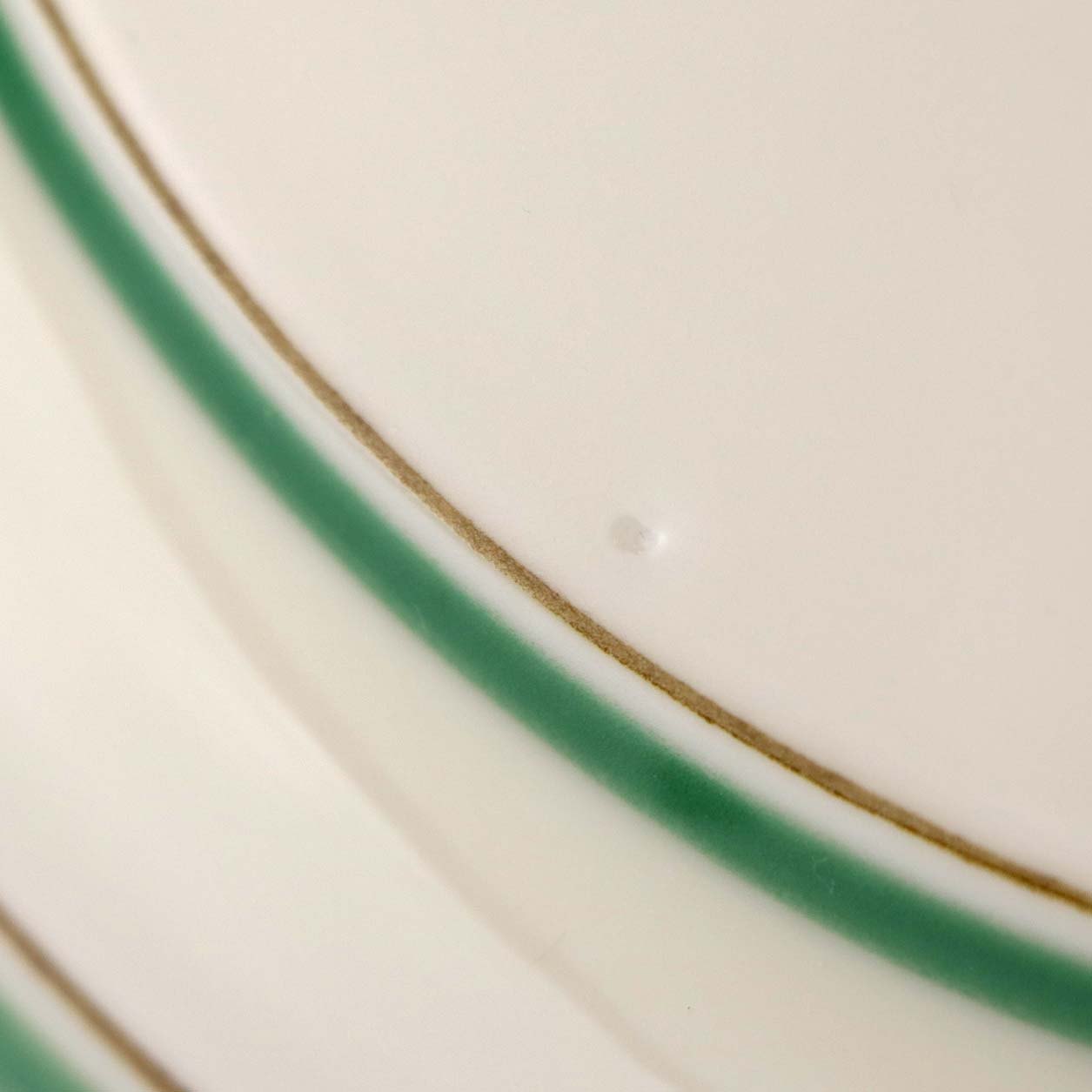 Service i glat cremefarvet porcelæn med grøn og sort kantstreg samt dekoration af blomster og grene i sort streg.