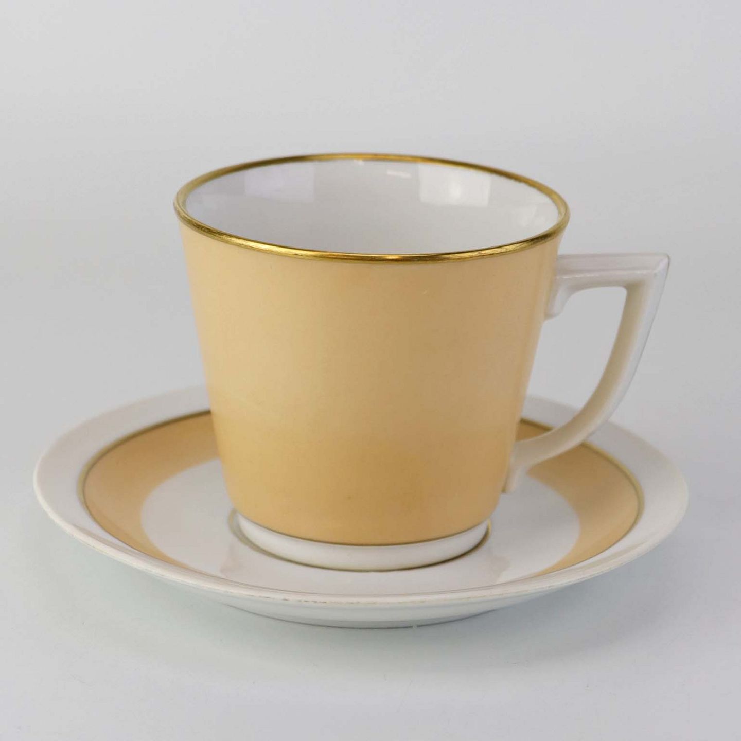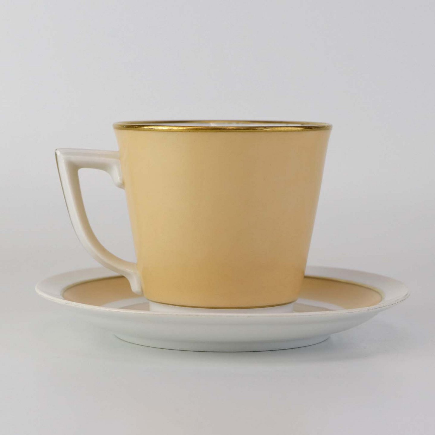 Service i glat hvid porcelæn med sandfarvet dekoration og gylden kant.