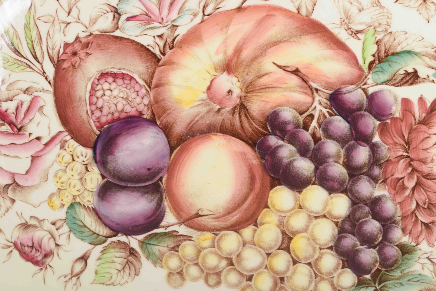Johnson Bros. Very large Serving Platter, early-20th century.Rectangular platter with rounded corners in earthenware. Decorated with a central multicolored transfer print of fruit and flowers, framed by a brown ornamental border along the rim.