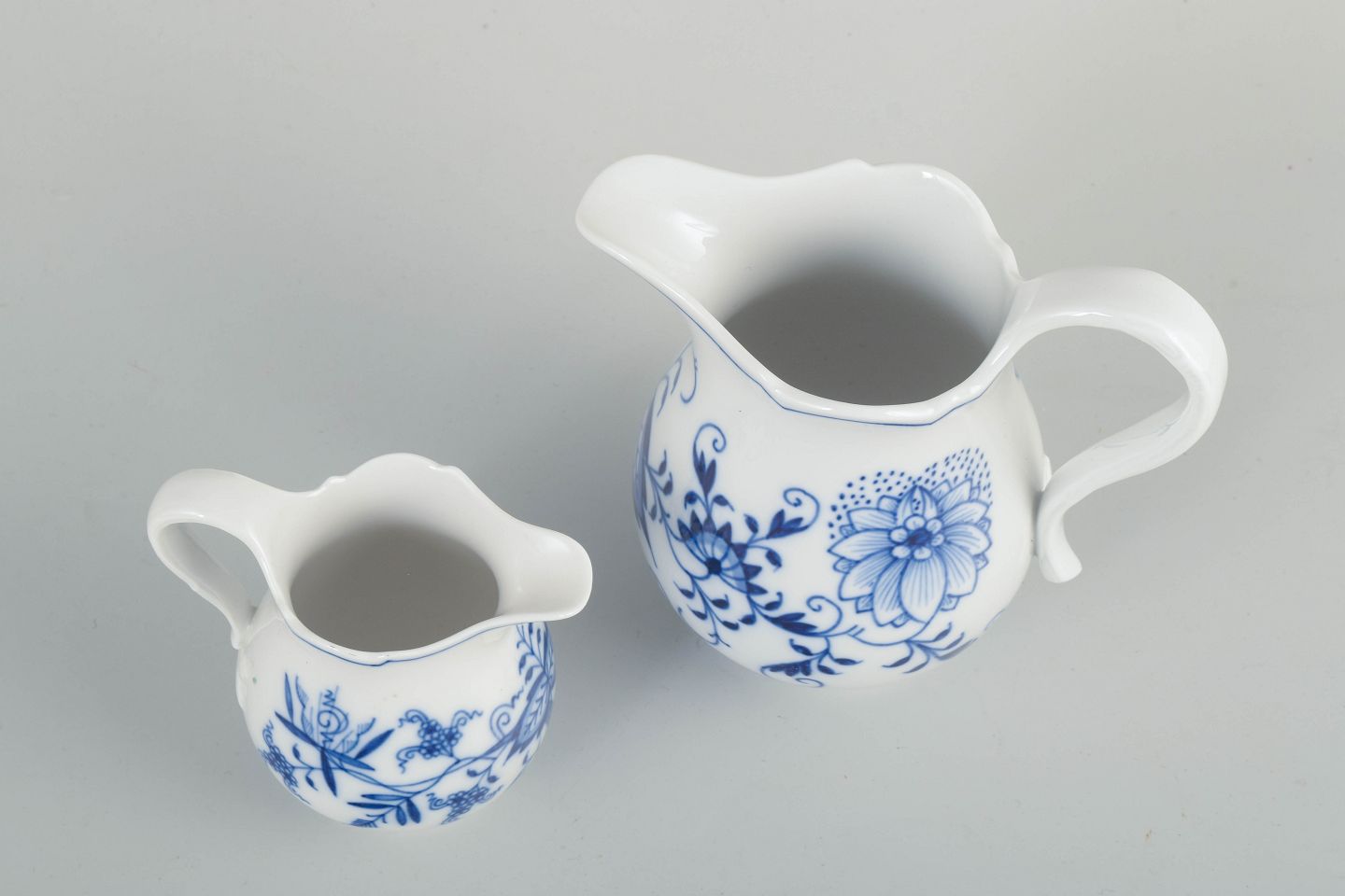 Organically shaped porcelain creamers with white glaze and hand-painted blue floral decoration in underglaze. Classic scalloped rim and curved handle.