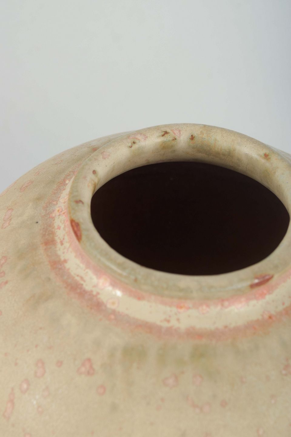 Organically shaped spherical vase in wheel-thrown stoneware with a raw surface and multicolored glaze in pink, white, and beige tones.