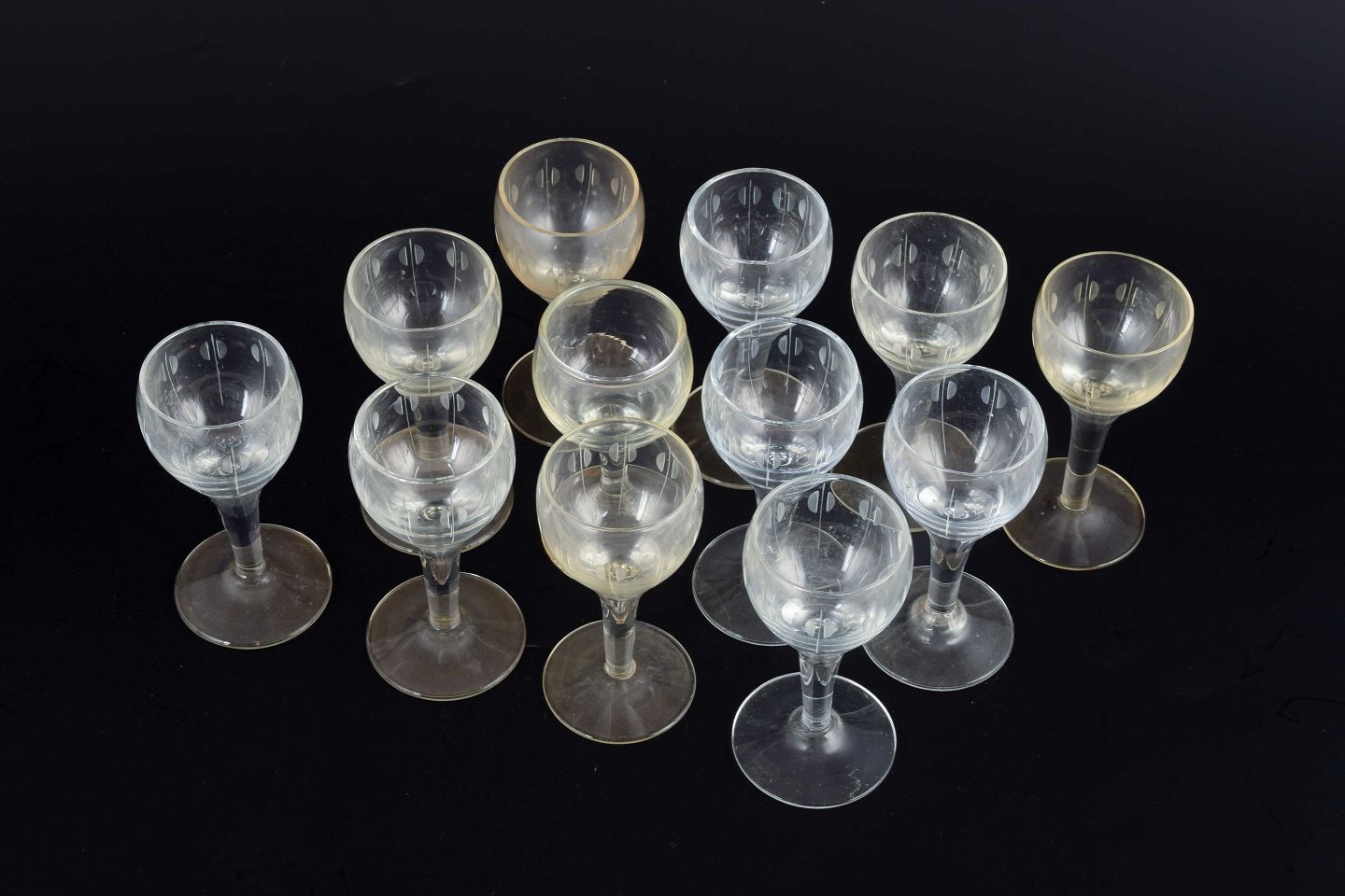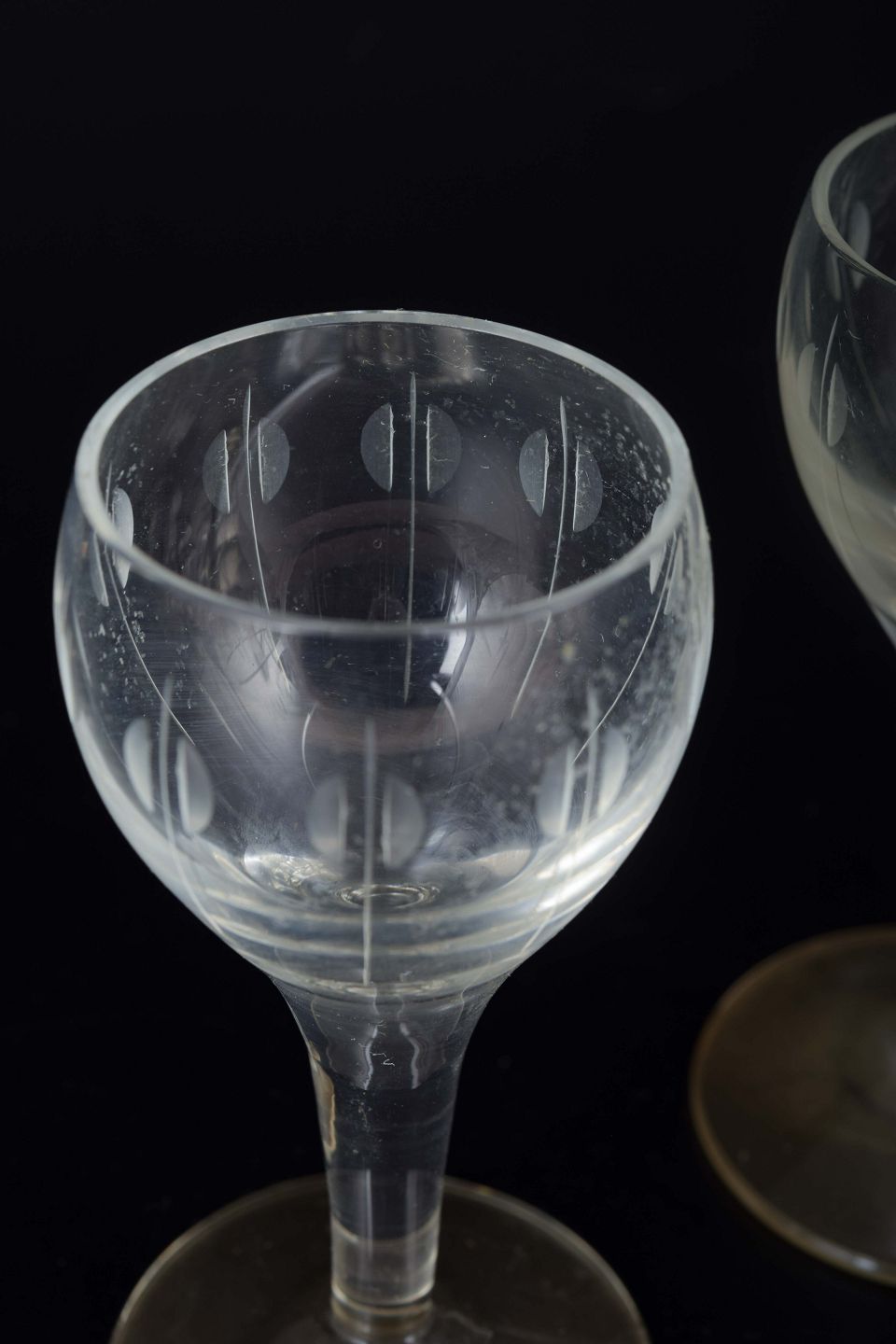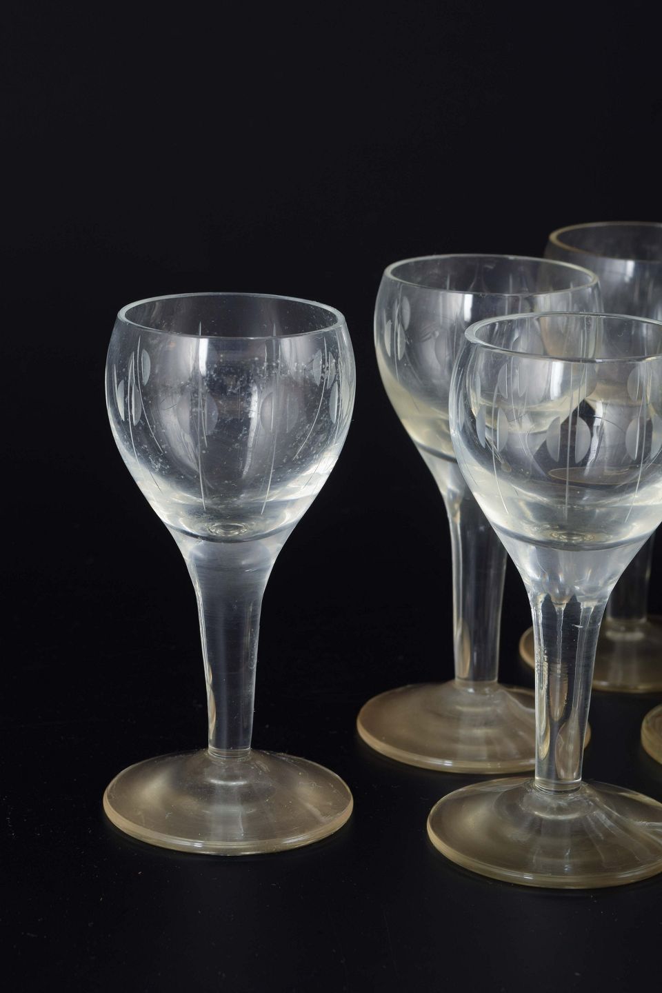 Mouth-blown glasses with short stems and small, rounded bowls. Decorated with an engraved pattern of vertical lines with oval elements.