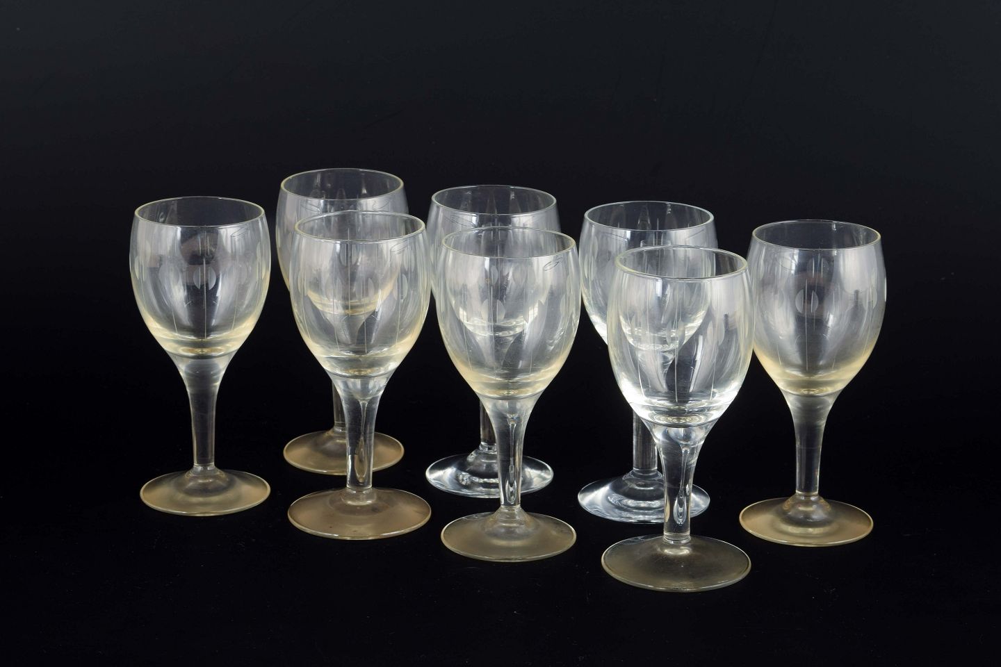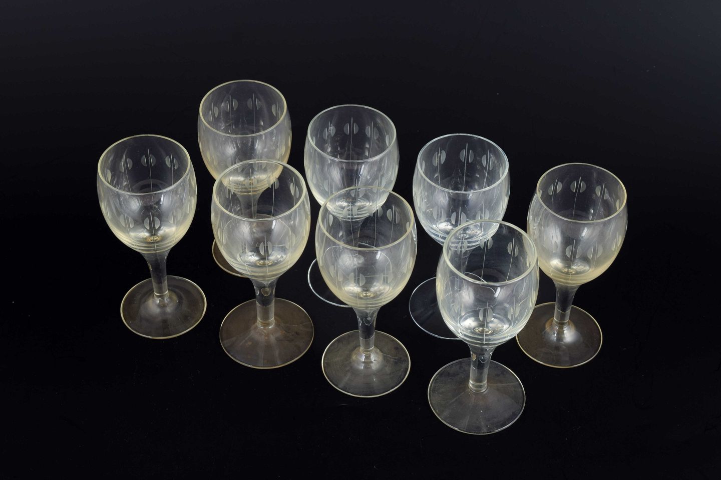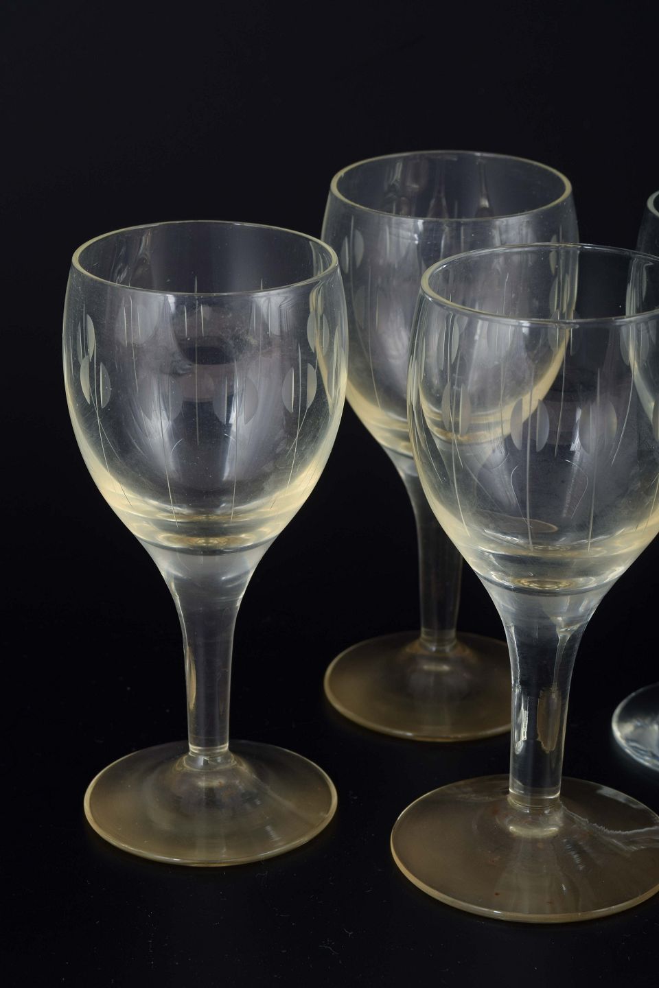 Mouth-blown glasses with short stems and tall, slender bowls. Decorated with an engraved pattern of vertical lines with oval elements.