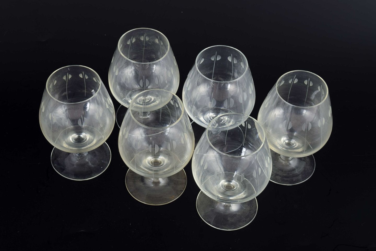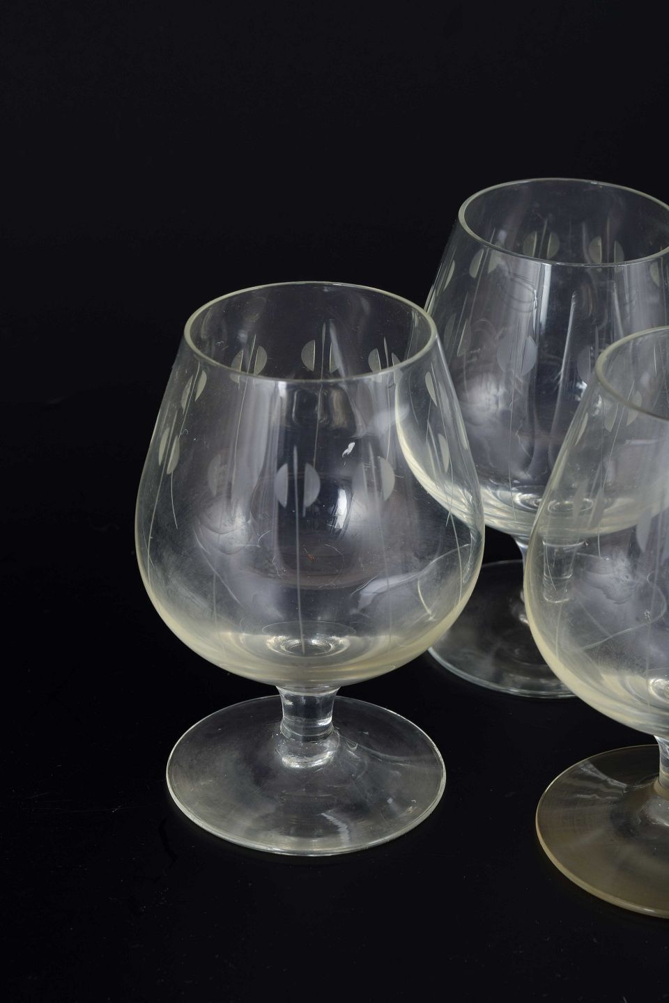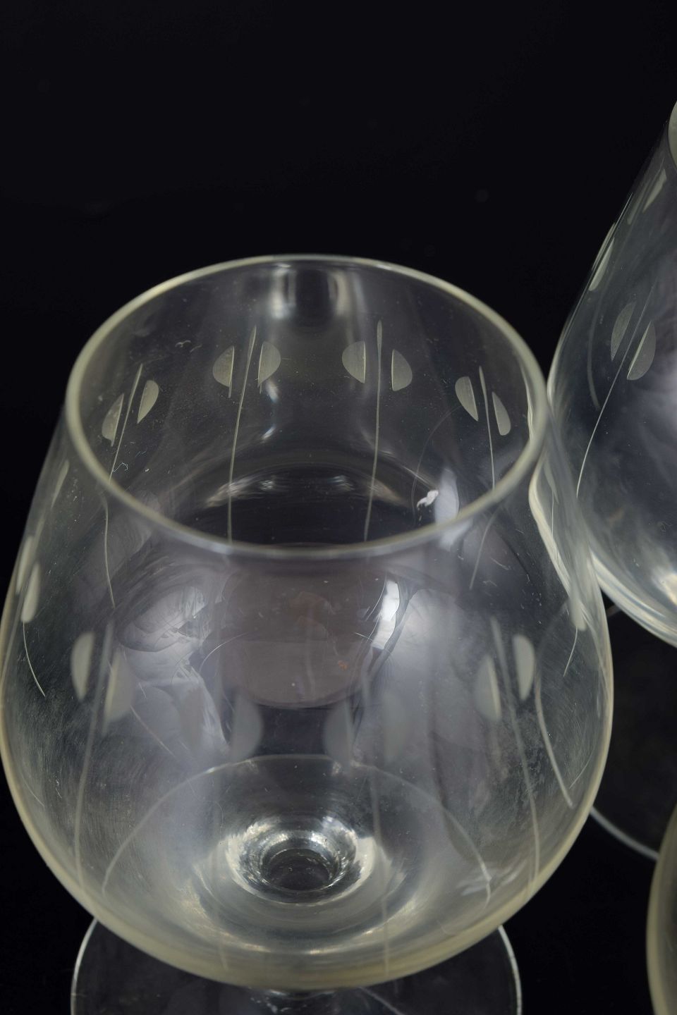 Mouth-blown glasses with short stems and rounded bowls. Decorated with an engraved pattern of vertical lines with oval elements.