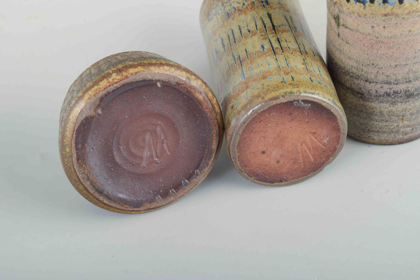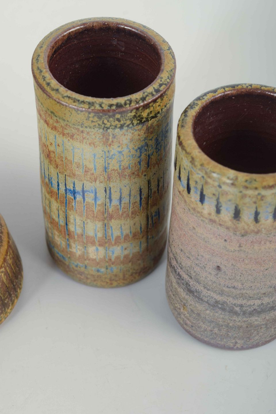 Three wheel-thrown stoneware vases – two cylindrical and one lower, organically shaped. Decorated in multicolored glazes in green, blue, purple and earthy tones.
