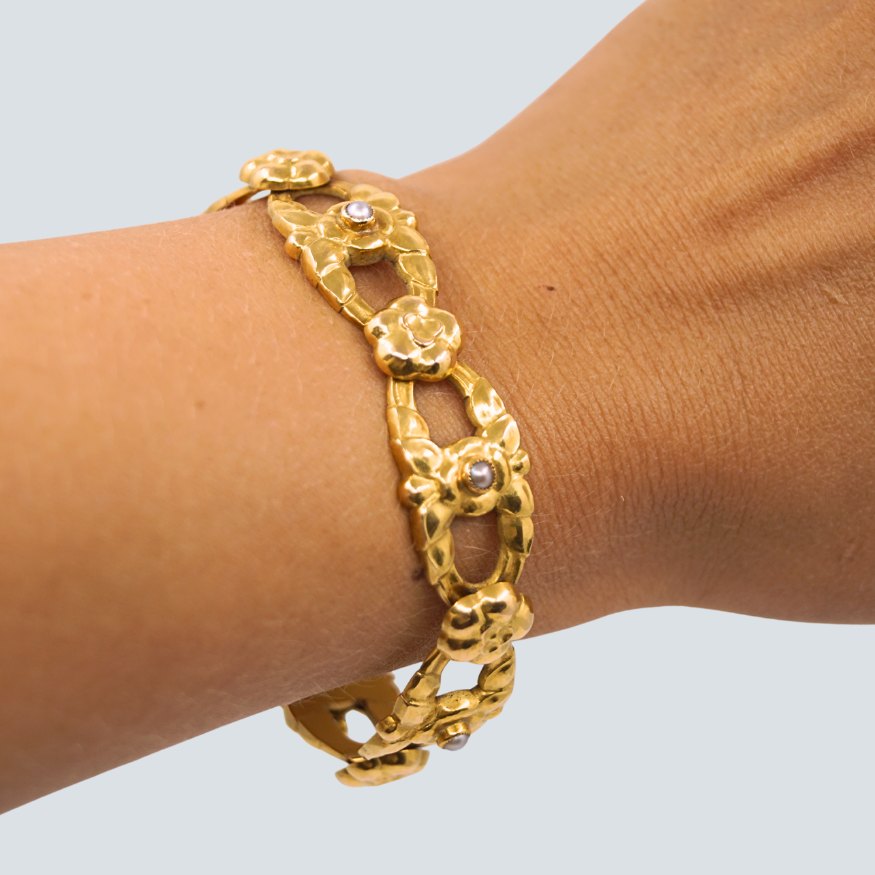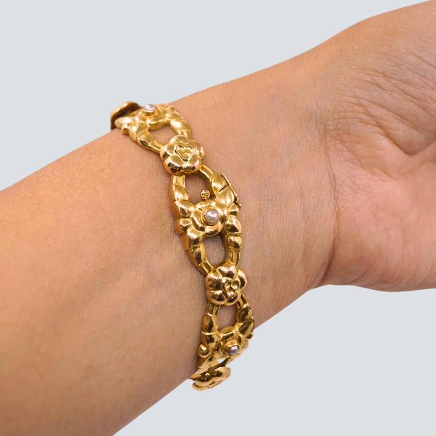 Georg Jensen gold jewellery.Early Georg Jensen bracelet, from 1930, in 18k gold, set with small pearls. Clasp with safetycatch.