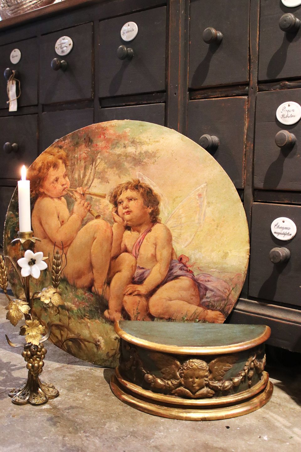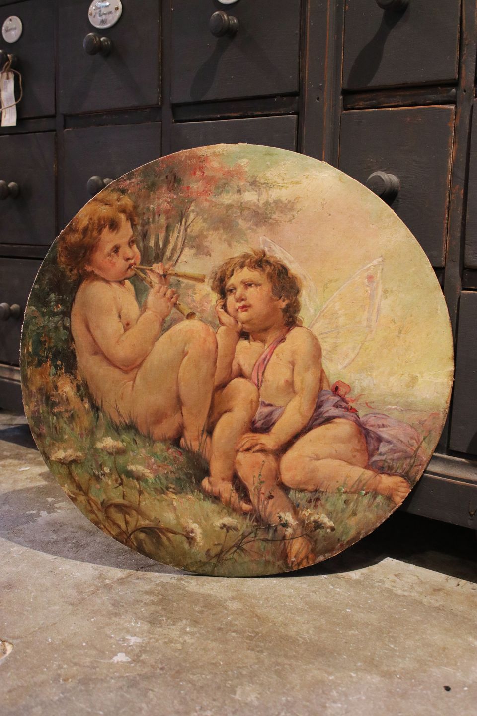 Old French 1800s oil painting on canvas with a motif of 2 small angels. The painting (the canvas is fixed on a wooden board) Dia.: 57cm.Item number: Engle maleri 1