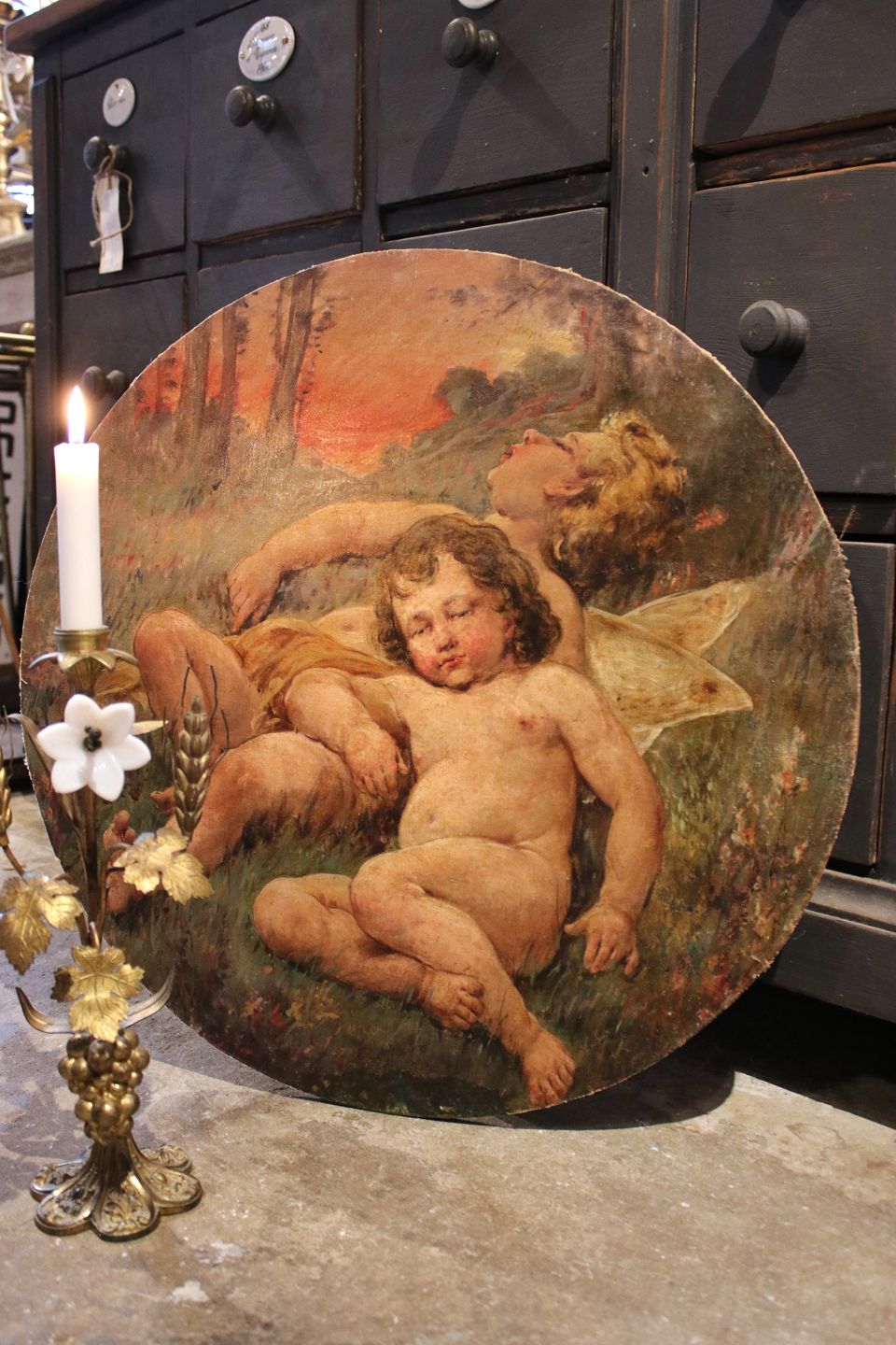 Old French 1800s oil painting on canvas with a motif of 2 small angels. The painting (the canvas is fixed on a wooden board) Dia.: 57cm.Item number: Engle maleri 2