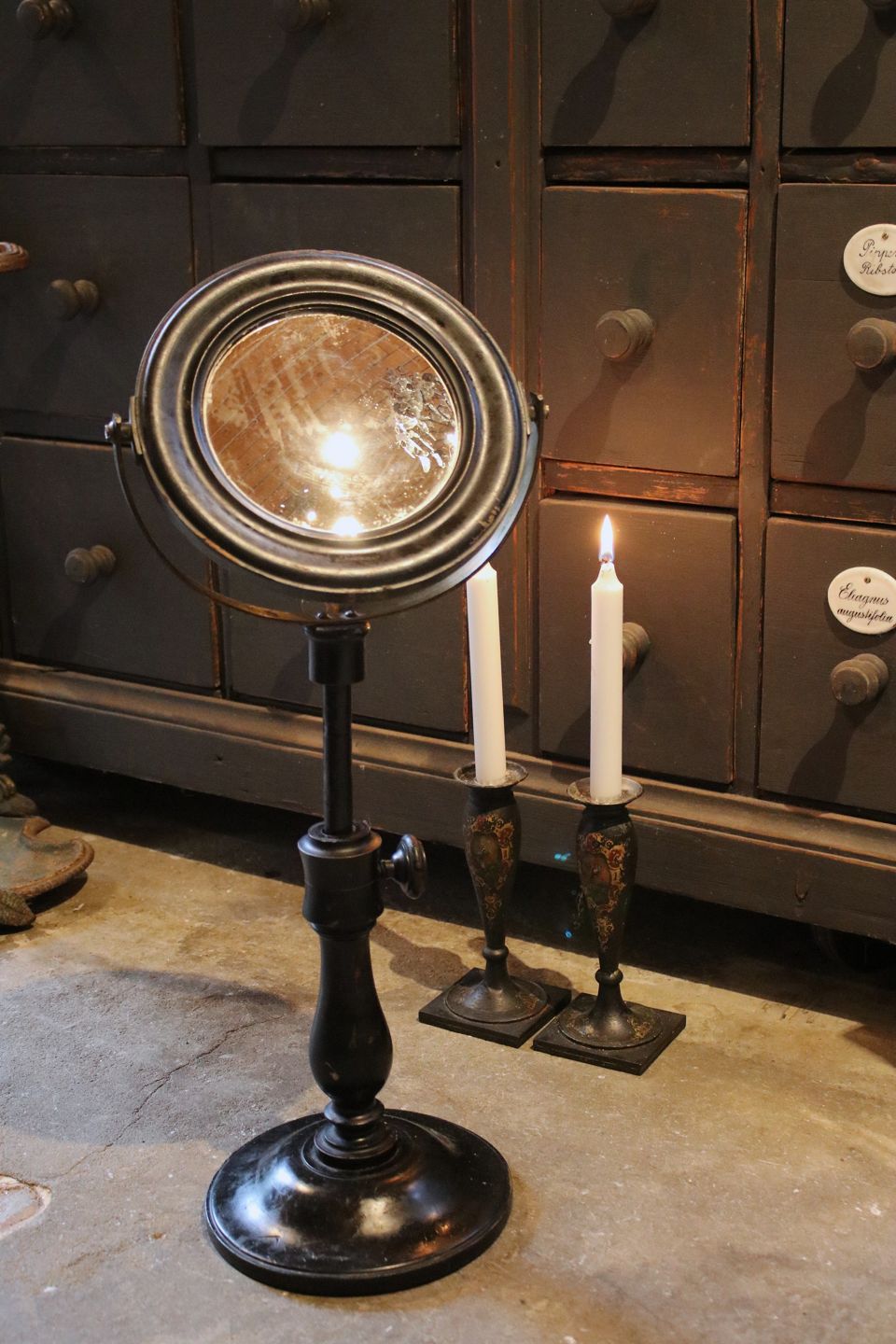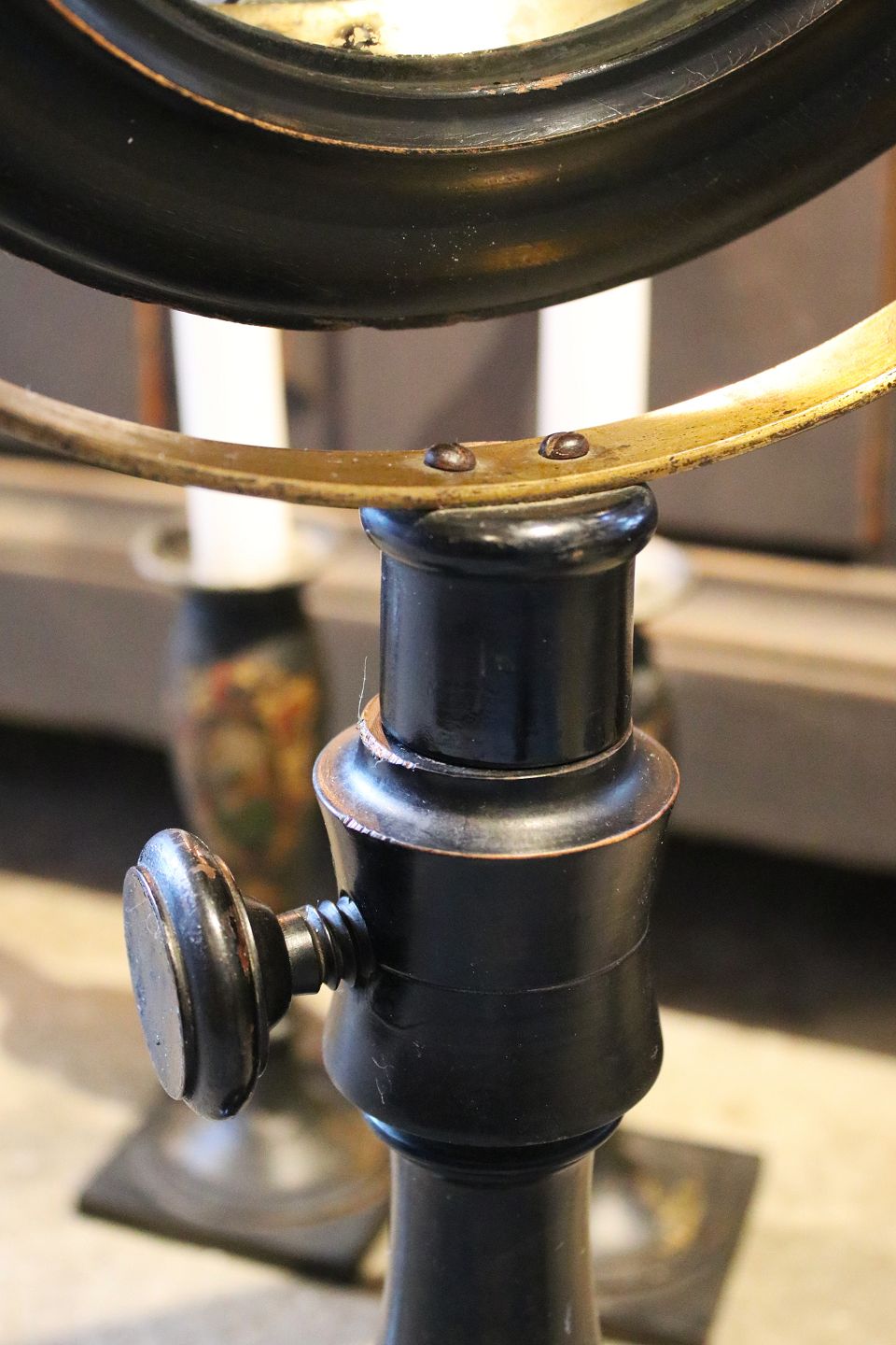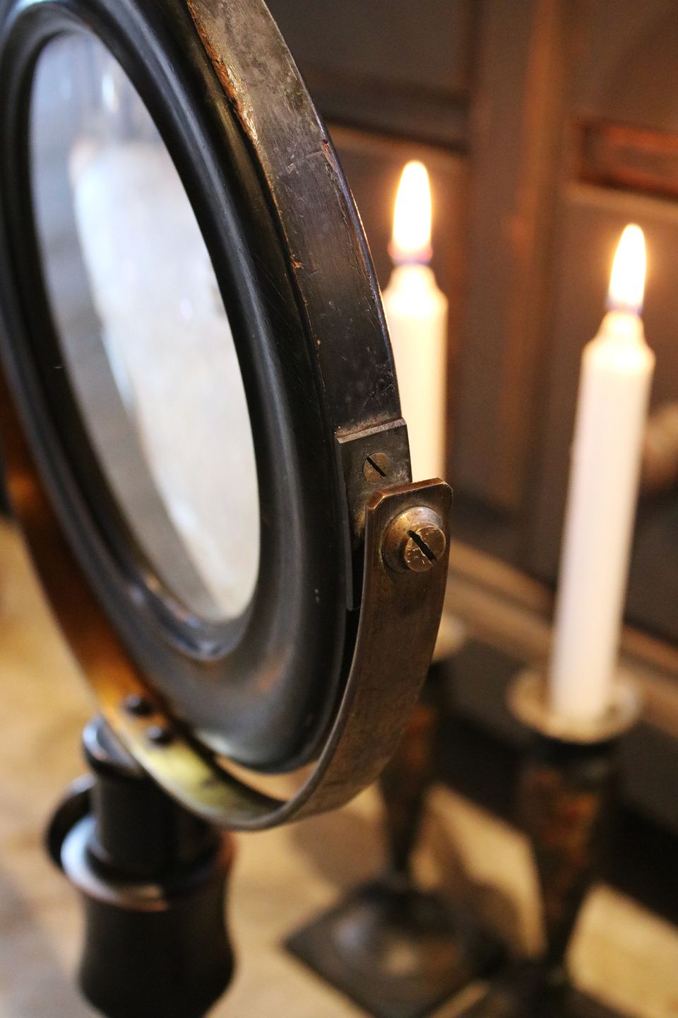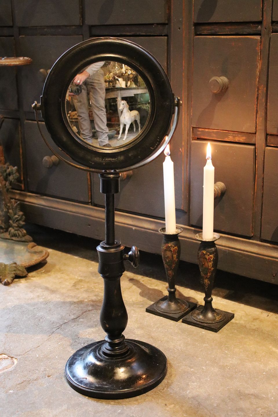 Old French 19th century tilting mirror in black painted wood / brasswith double mirror glass (normal / magnifying).