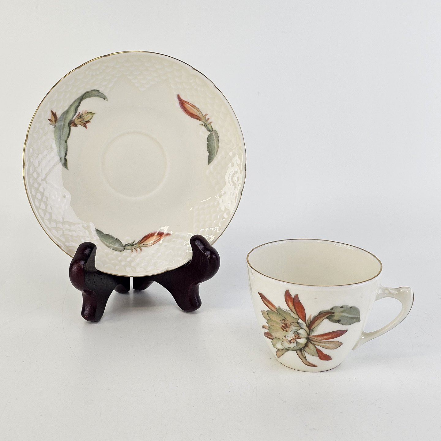 Kaktus er cremefarvet porcelæn i skælform, dekoreret med kaktusblomster og guldkant