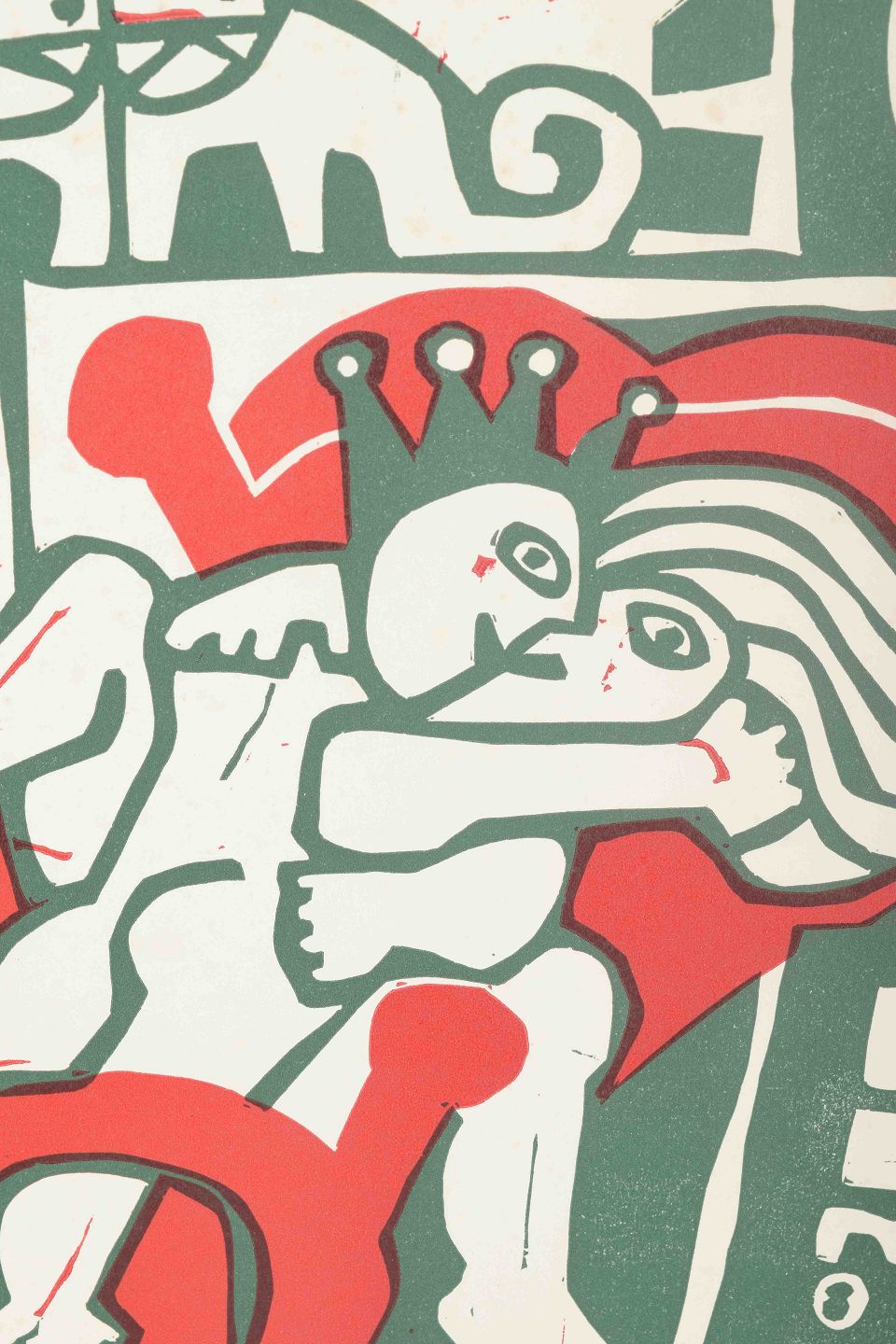 An expressive and imaginative work with strong graphic impact, where figures, architectural elements, and text merge into a powerful visual statement. The motif balances between humor and social commentary, with the message “2 voksne 1 verden / 1 barn 2 verdener” (“2 adults 1 world / 1 child 2 worlds”).