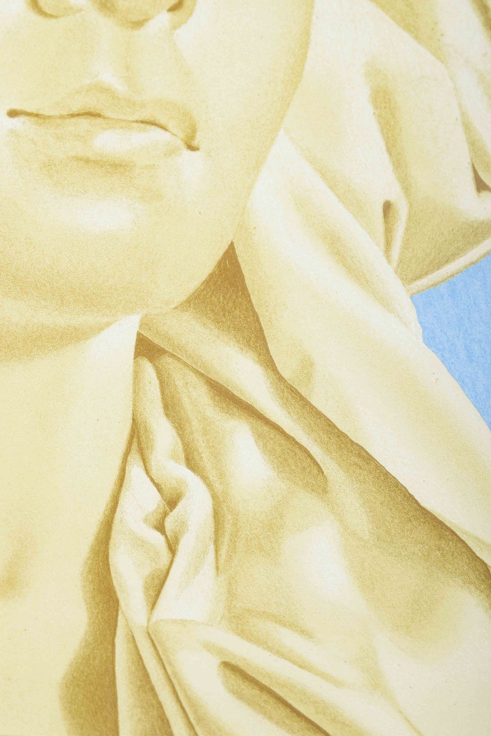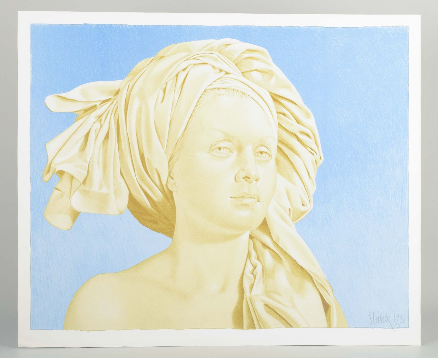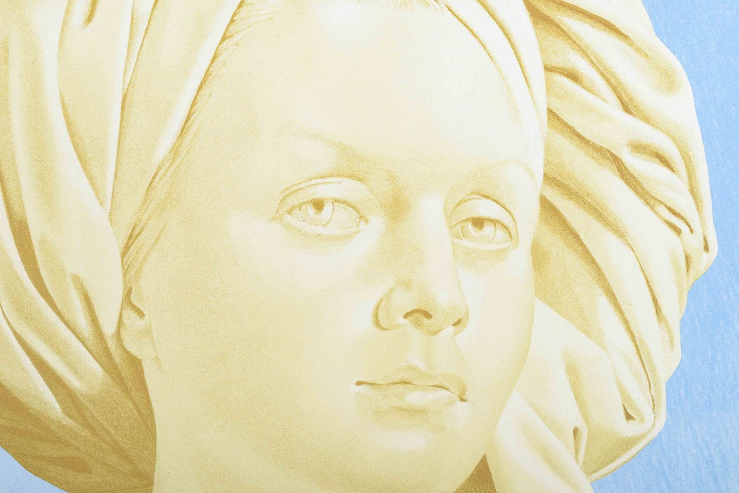 A naturalistic and meticulously rendered portrait of a woman with a headscarf, set against a clear blue background. The work reflects Strøbek’s distinctive superrealist style, inspired by 17th-century trompe-l’œil, where precision and illusion create an almost photographic presence.