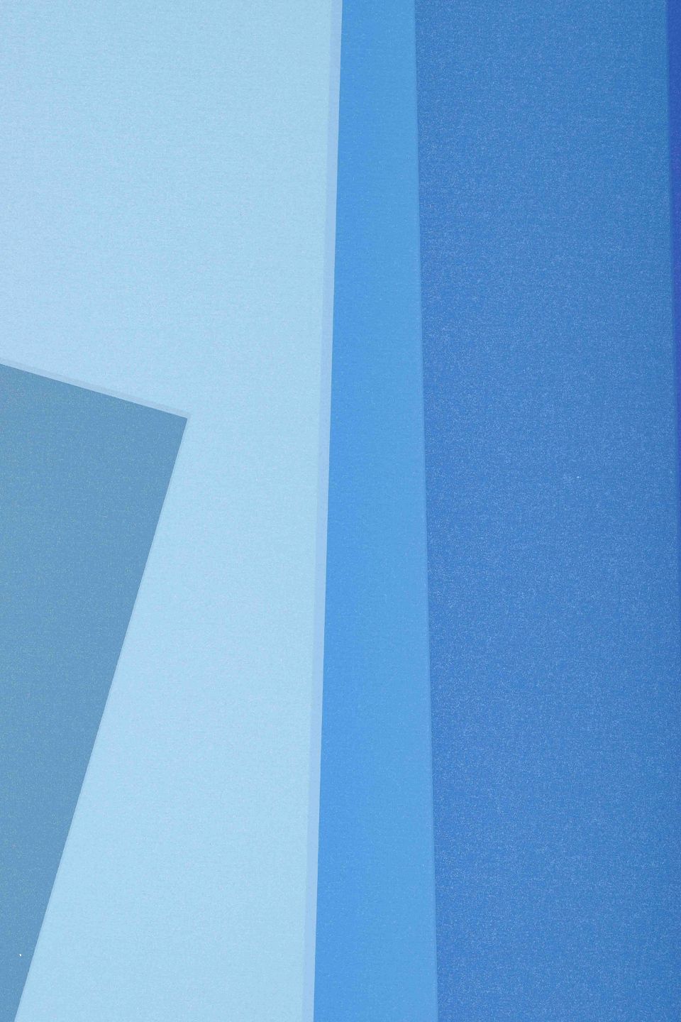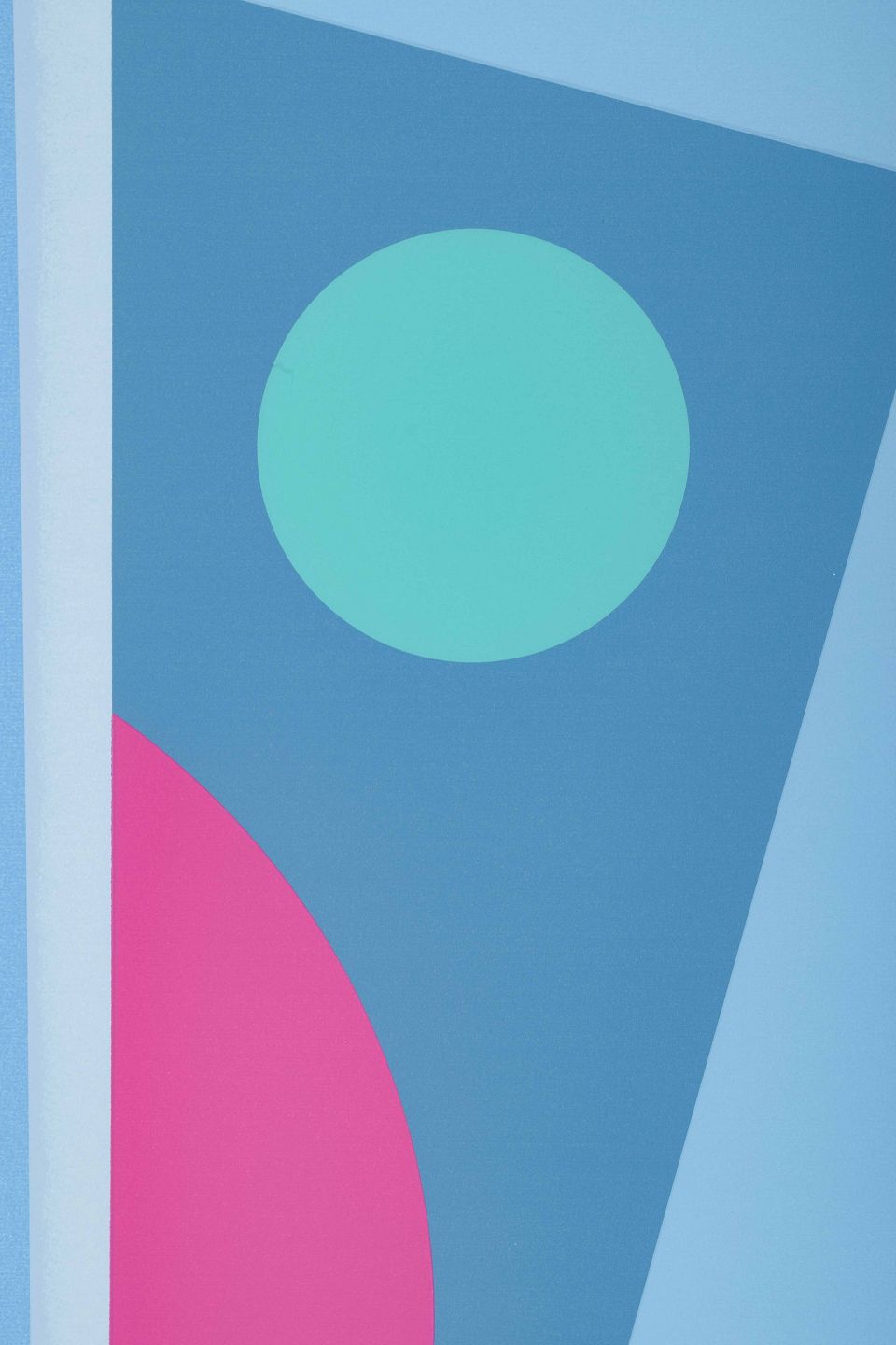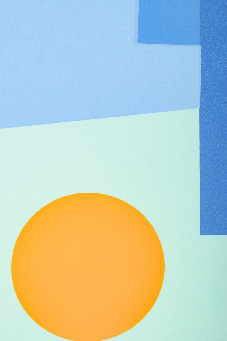 A colorful geometric abstract work with sharp forms and strong contrasts in blue, pink, green, and orange. The clean surfaces and precise composition emphasize Kragh-Jacobsen’s focus on the constructive and formal language of art, where color itself becomes the main element.