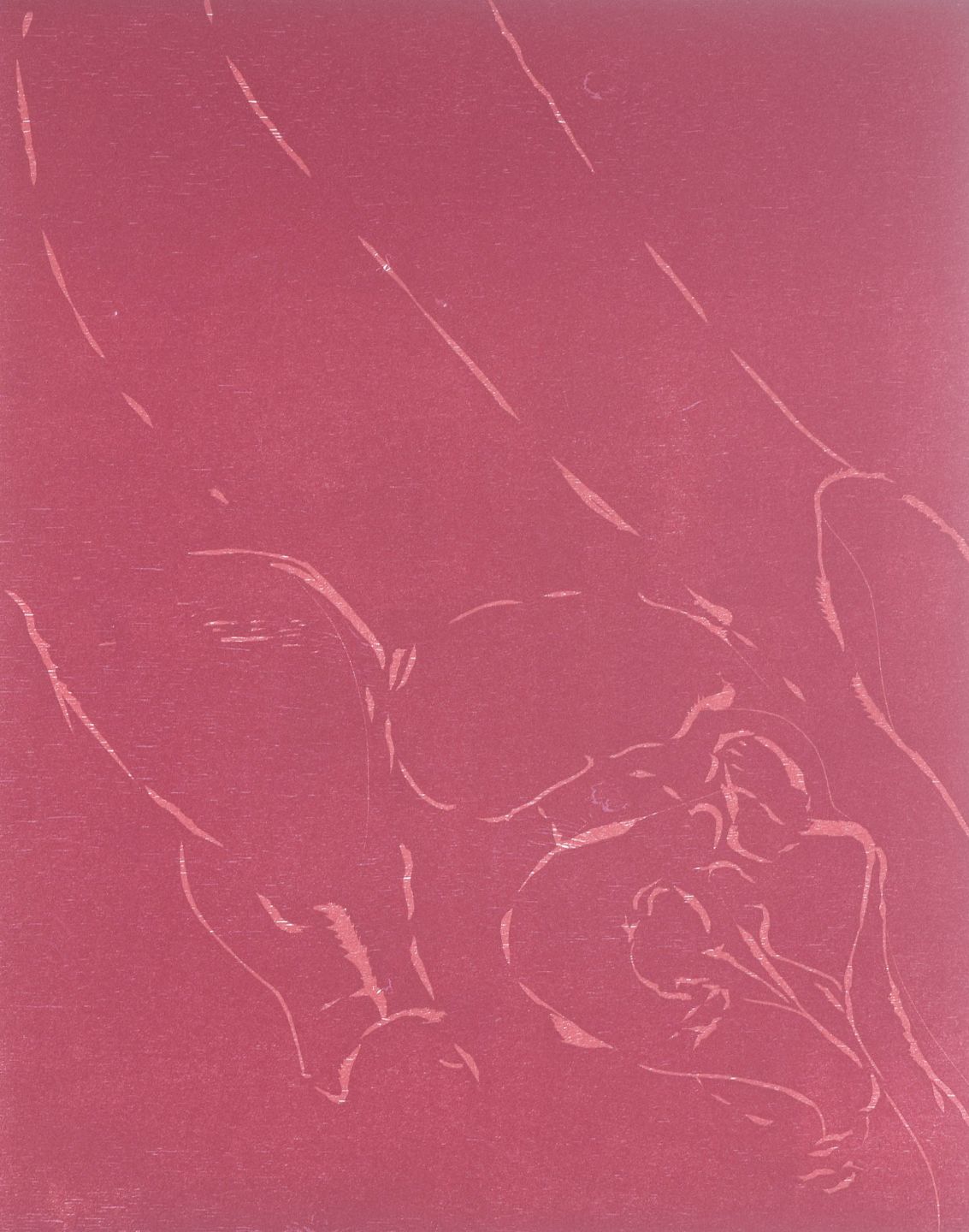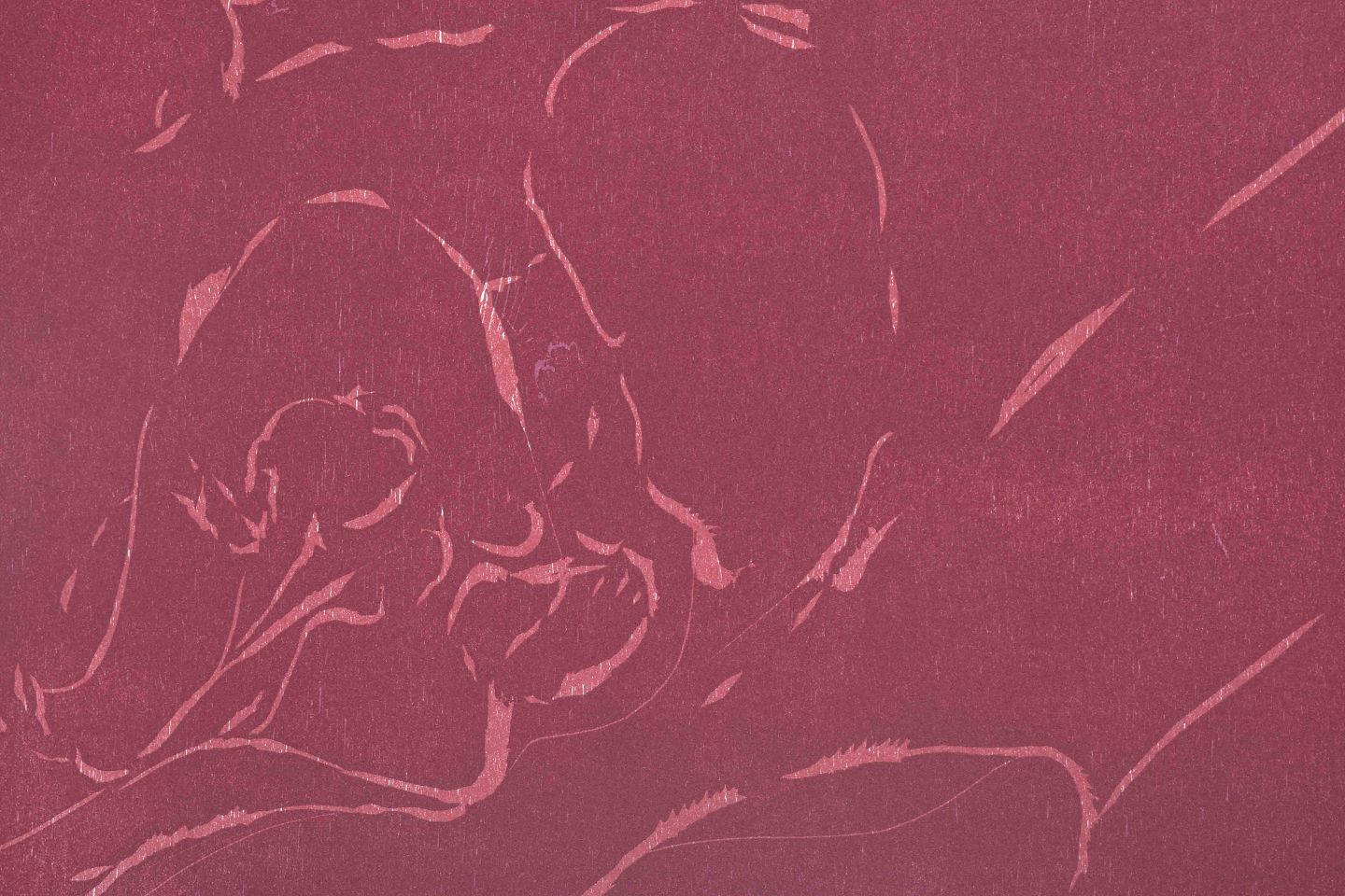 Abstract composition in red tones, where delicate contours suggest human forms in a restrained yet expressive manner. A graphic work that exemplifies the artist’s ability to convey presence and drama with minimal means.