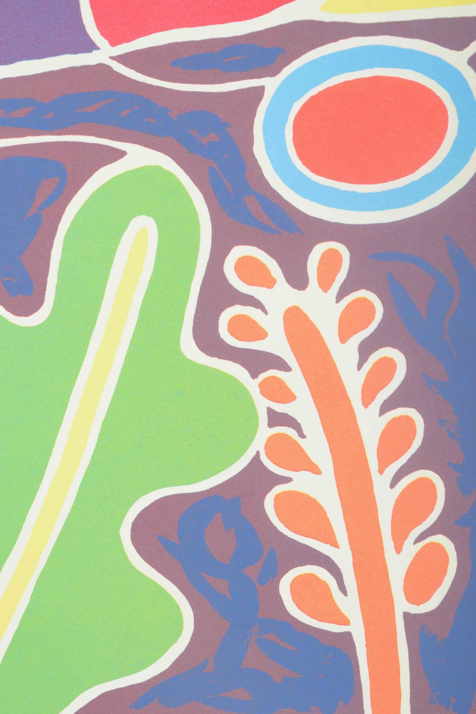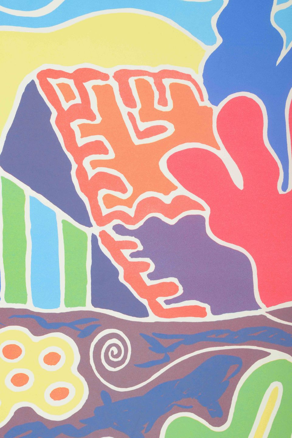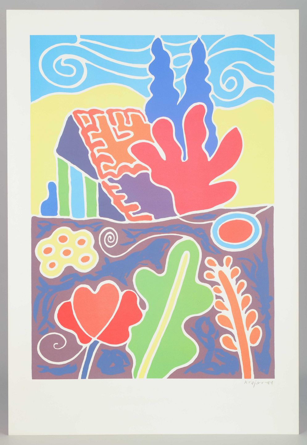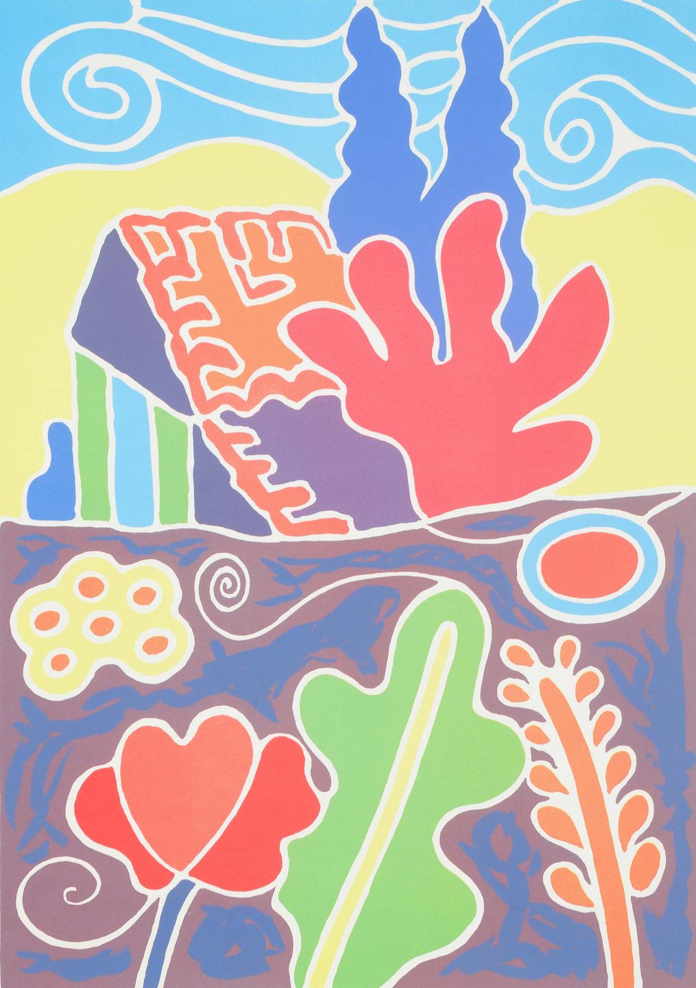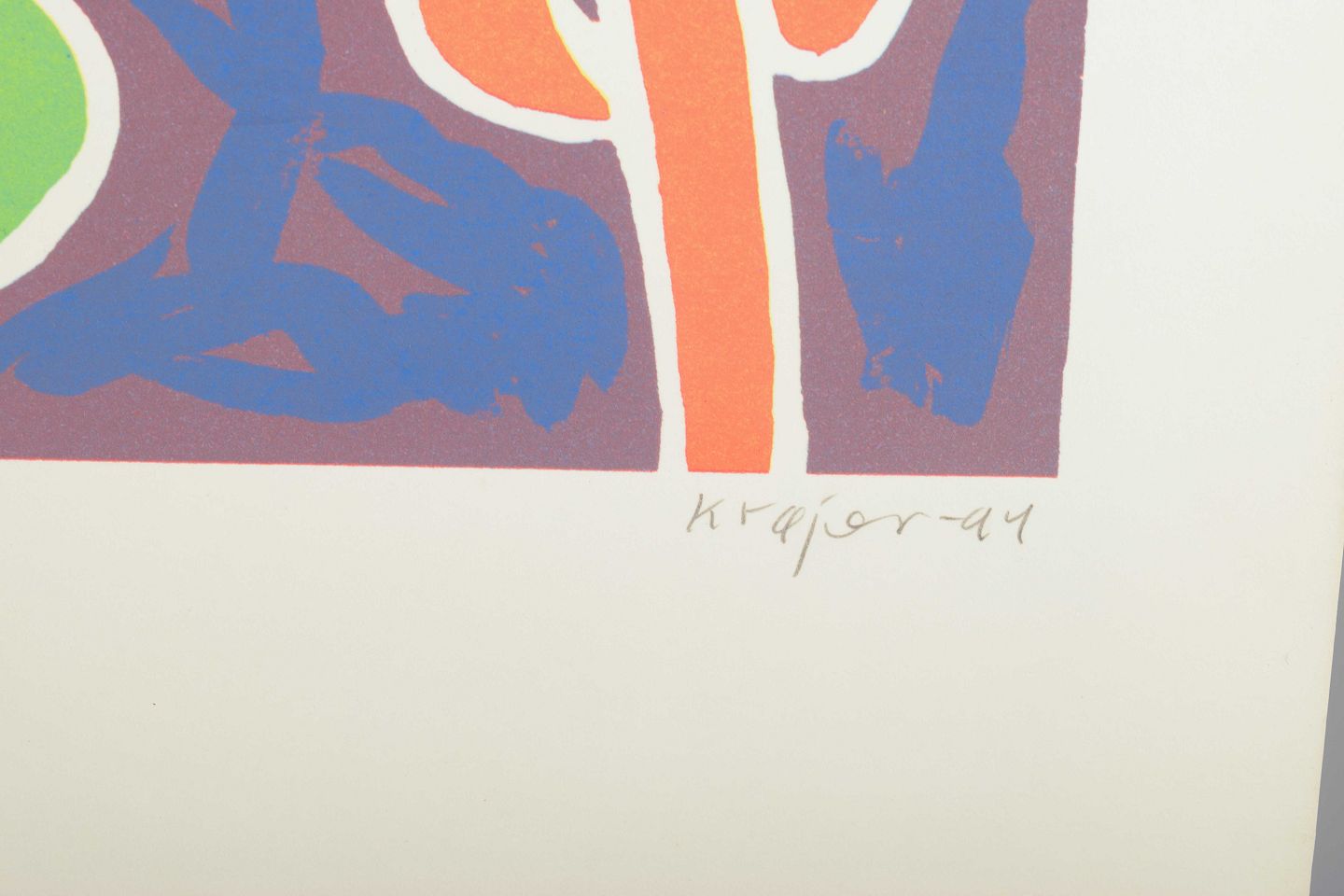 Colorful and decorative composition with a house, trees, and flowers in a stylized visual language. The work reflects Krøjer’s characteristic play with color fields, contrasts, and organic contours, creating an immediate and vibrant atmosphere.