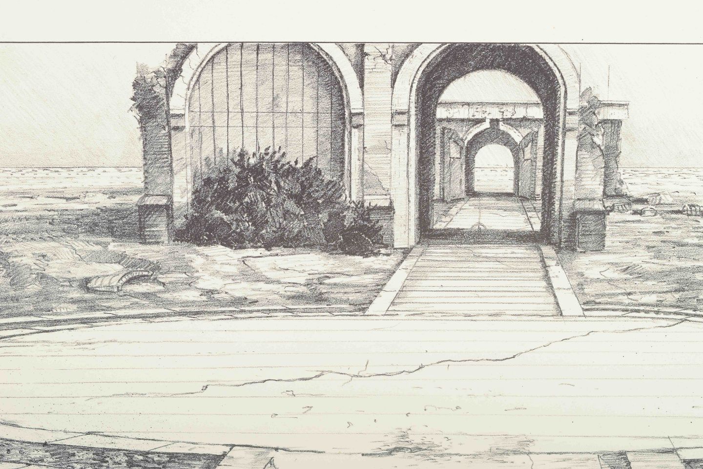 A detailed and atmospheric work with an architectural motif, where arched gates and decaying paths lead the viewer’s eye into the depth. The fine linework creates an almost dreamlike atmosphere, balancing between reality and fantasy.