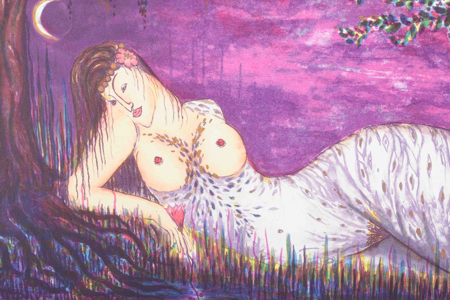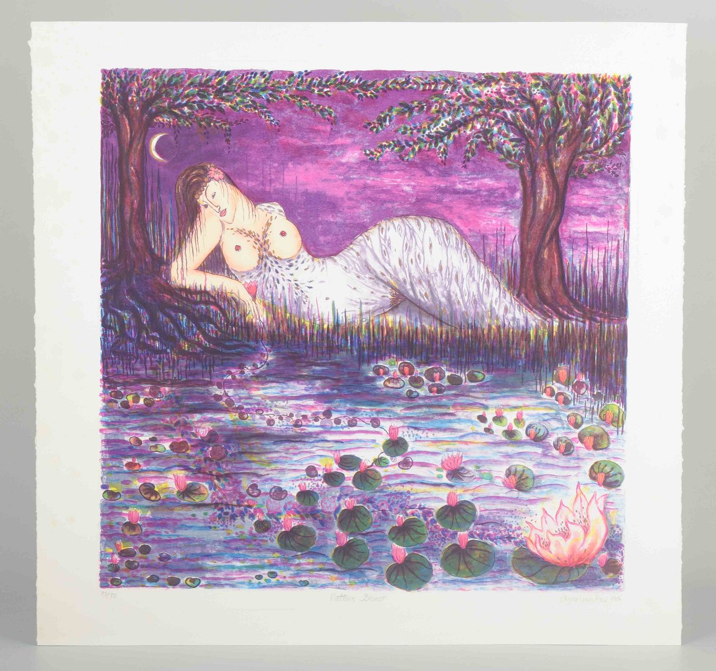A poetic and colorful work, depicting a reclining female figure beneath the night sky, surrounded by water lilies and flowers in a dreamlike landscape. The work reflects Winther’s characteristic organic forms and sensual visual language.