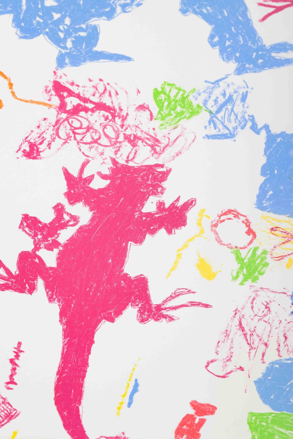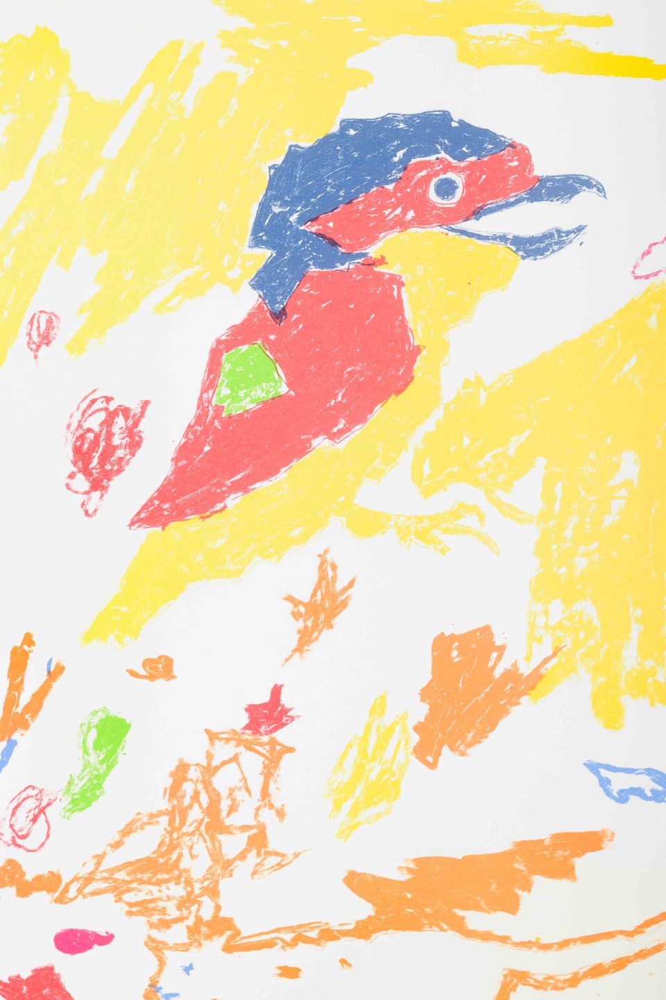 A colorful and imaginative work with figures reminiscent of animals and birds, executed in vibrant contrasting colors. The composition carries a playful and spontaneous character inspired by nature.