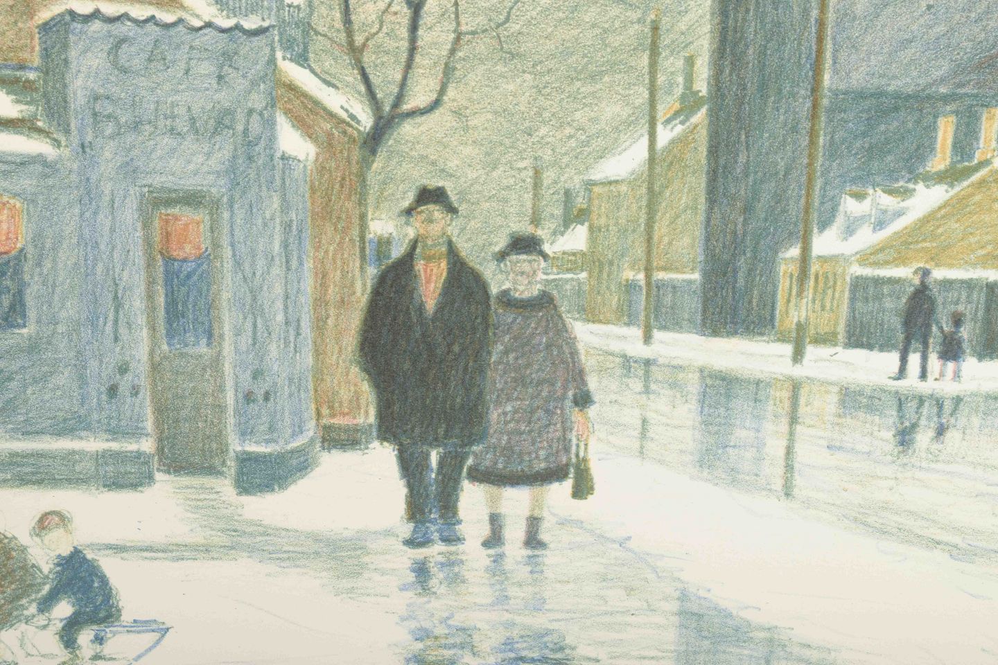 An atmospheric depiction of a working-class neighborhood in wintertime, where children play on the ice and passersby move along the snow-covered streets under a pale, cold sun. Bendtsen’s characteristic focus on everyday life is conveyed in this simple yet poetic rendering of the outskirts of the city.