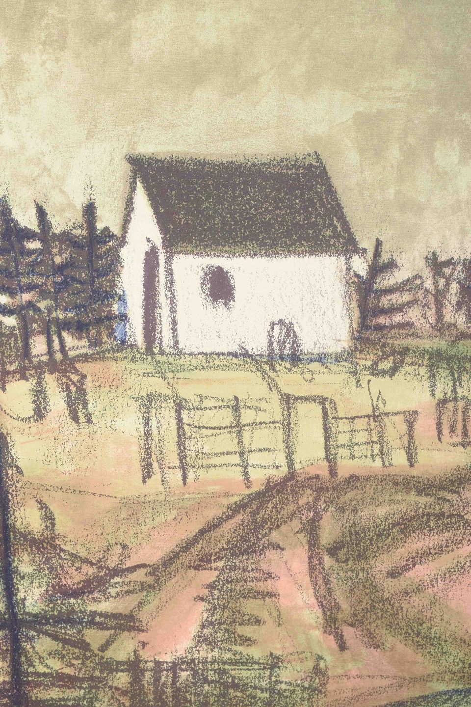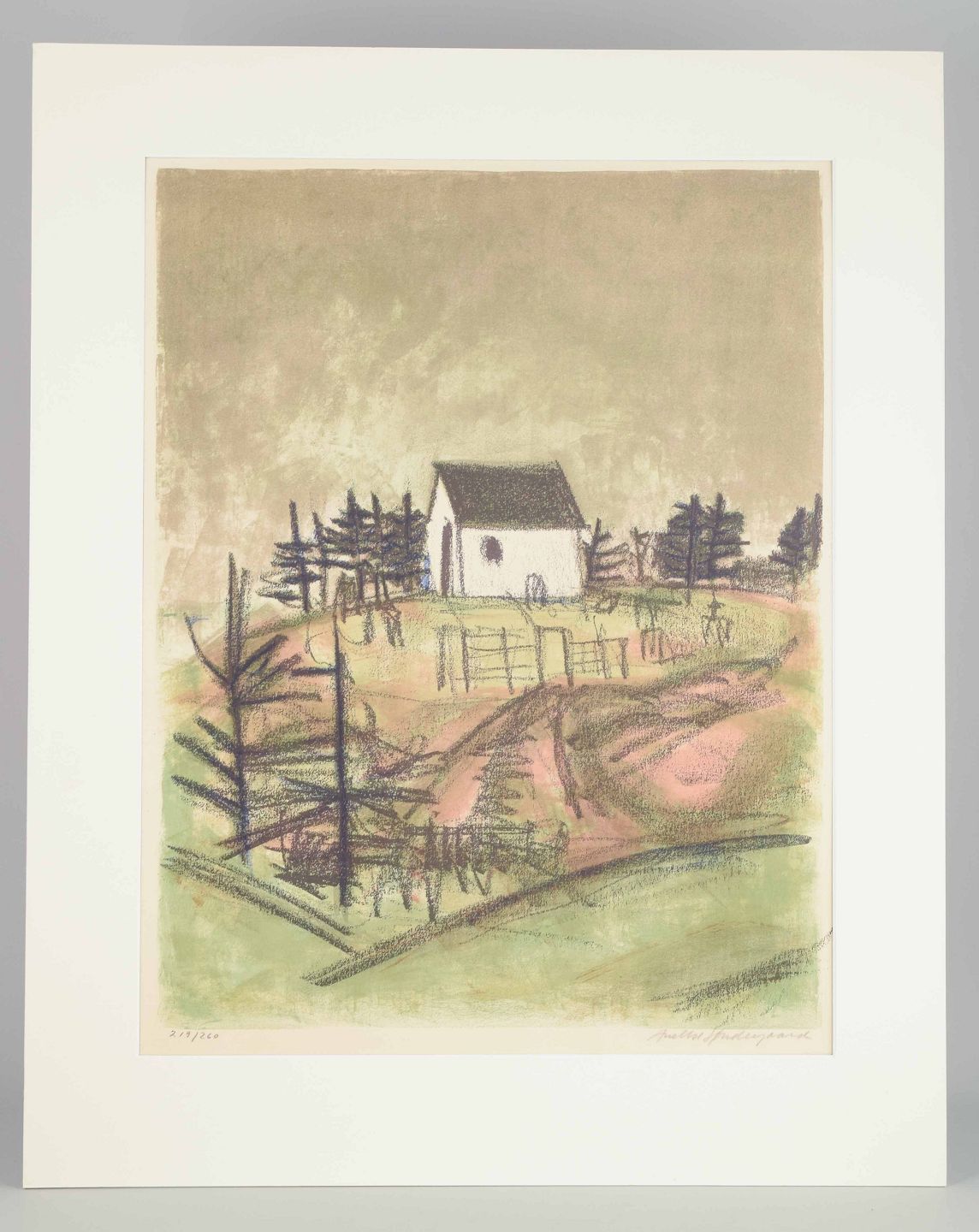 A poetic and atmospheric lithograph depicting a white house on a hilltop surrounded by trees and fences. The work is executed in Søndergaard’s characteristic simple and textural style, where soft tones and sketch-like lines create a calm and slightly dreamlike mood.