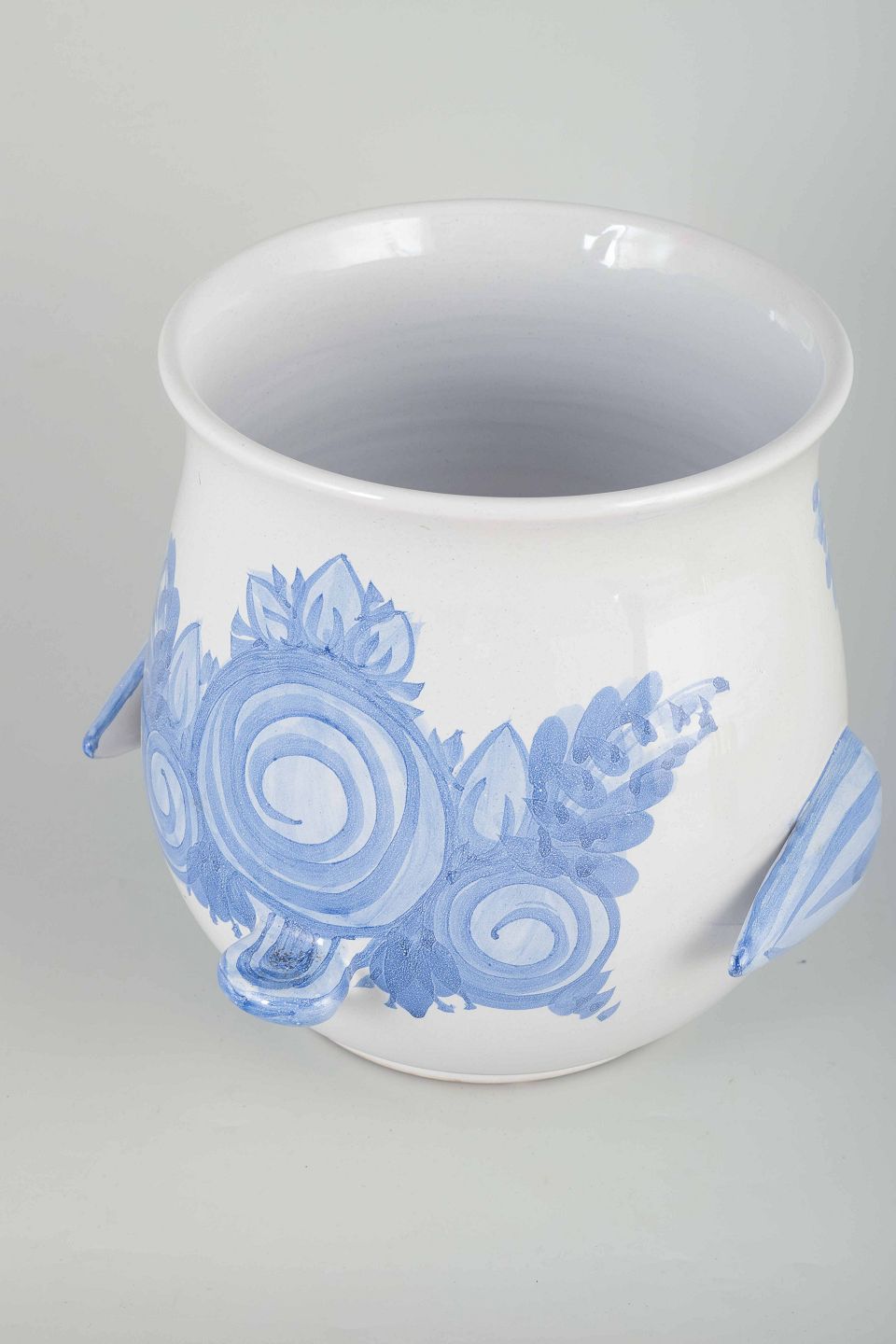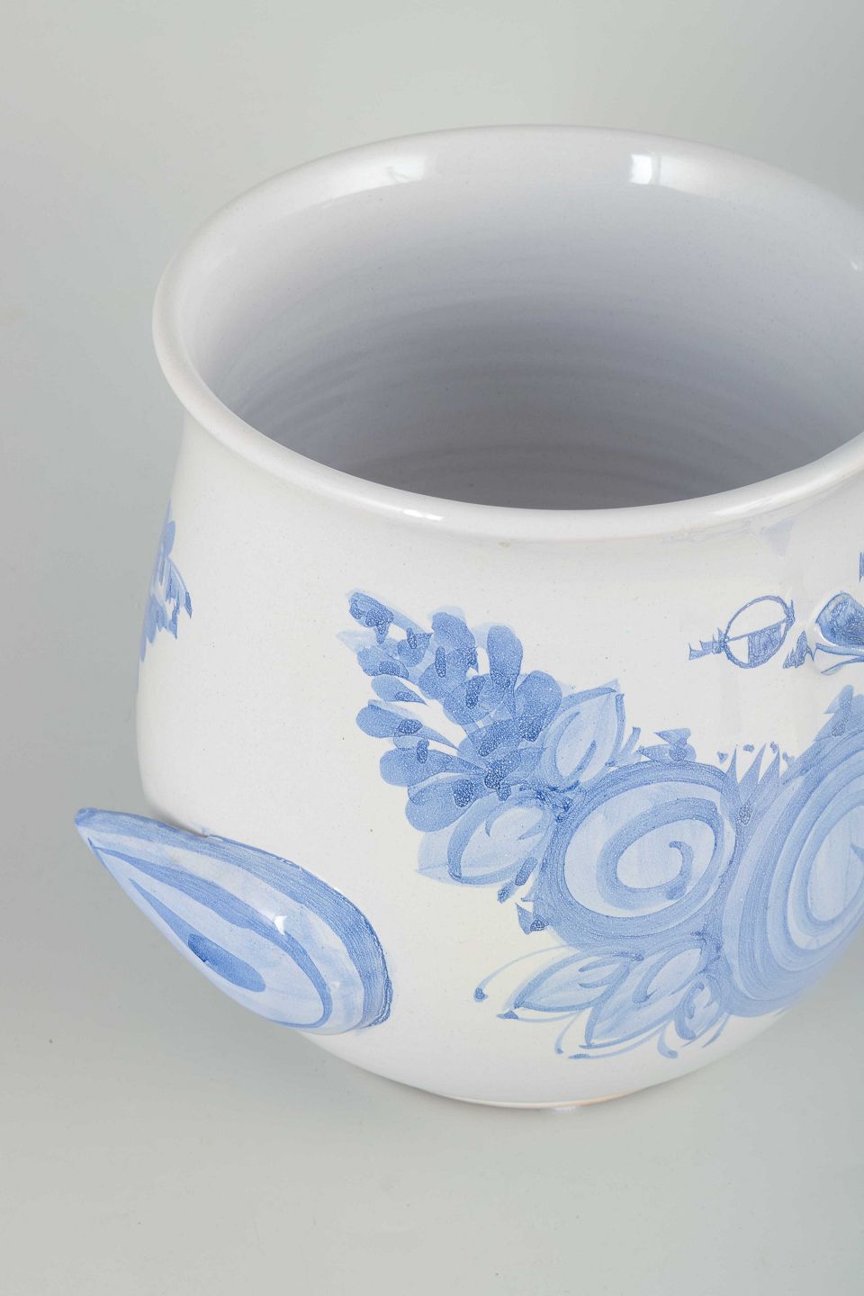 Organically shaped flowerpot cover in white-glazed faience with hand-painted blue spiral and floral motifs.