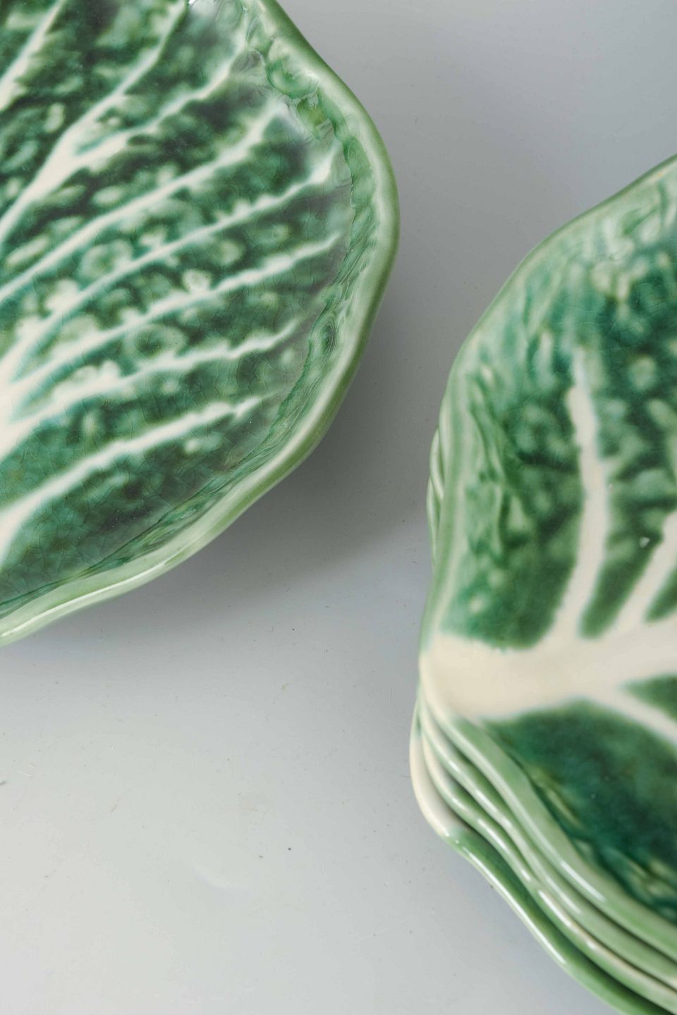 Secla, 5 plates, Portugal, 1960/70sOrganically shaped faience plates in majolica, made in the form of cabbage leaves with green glaze.