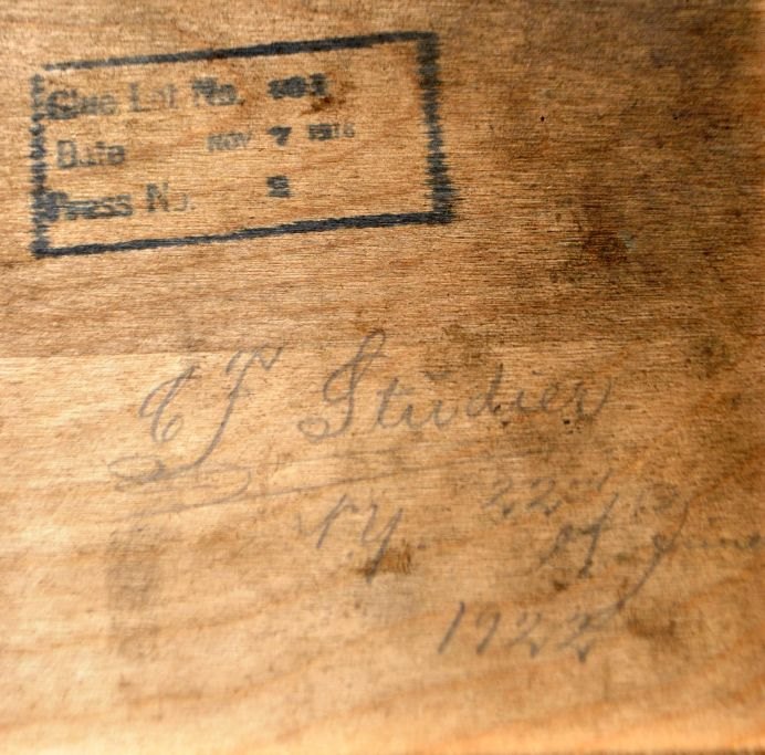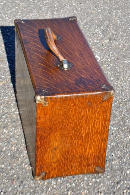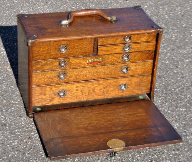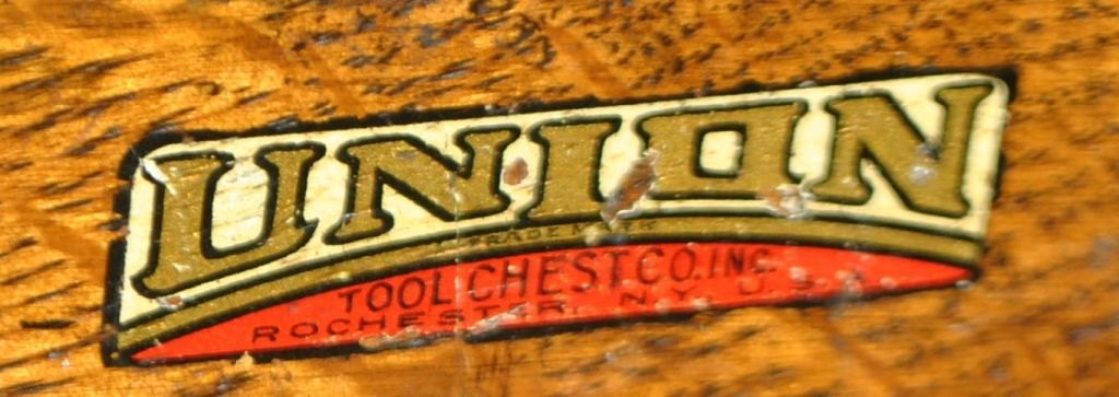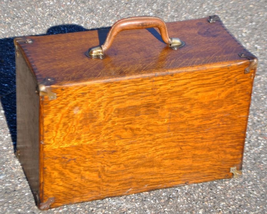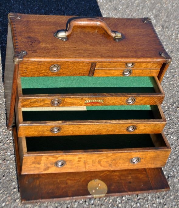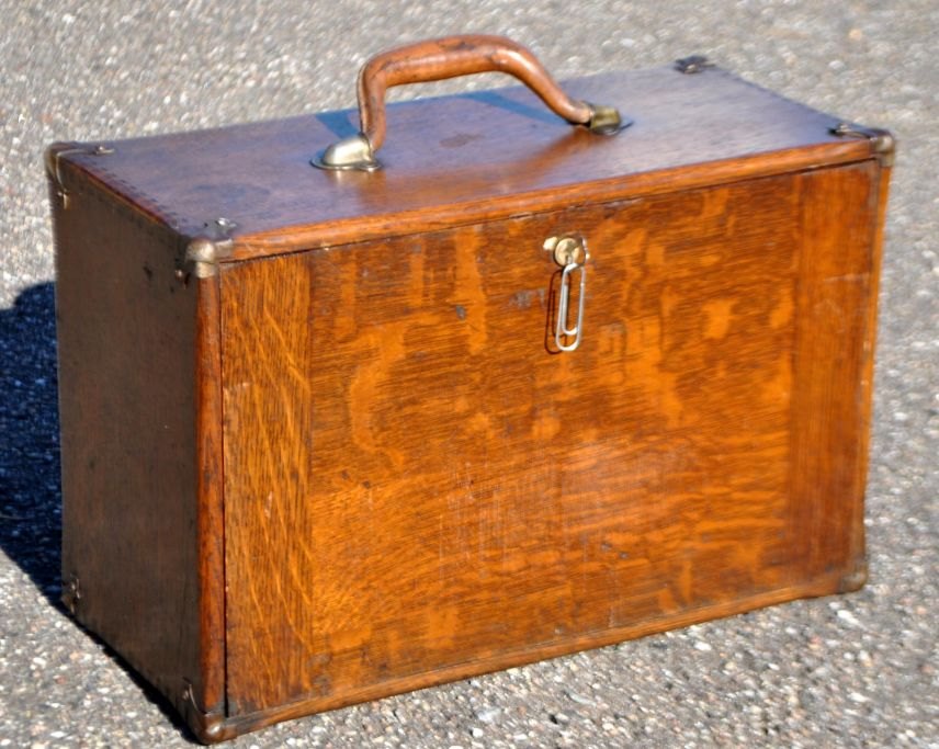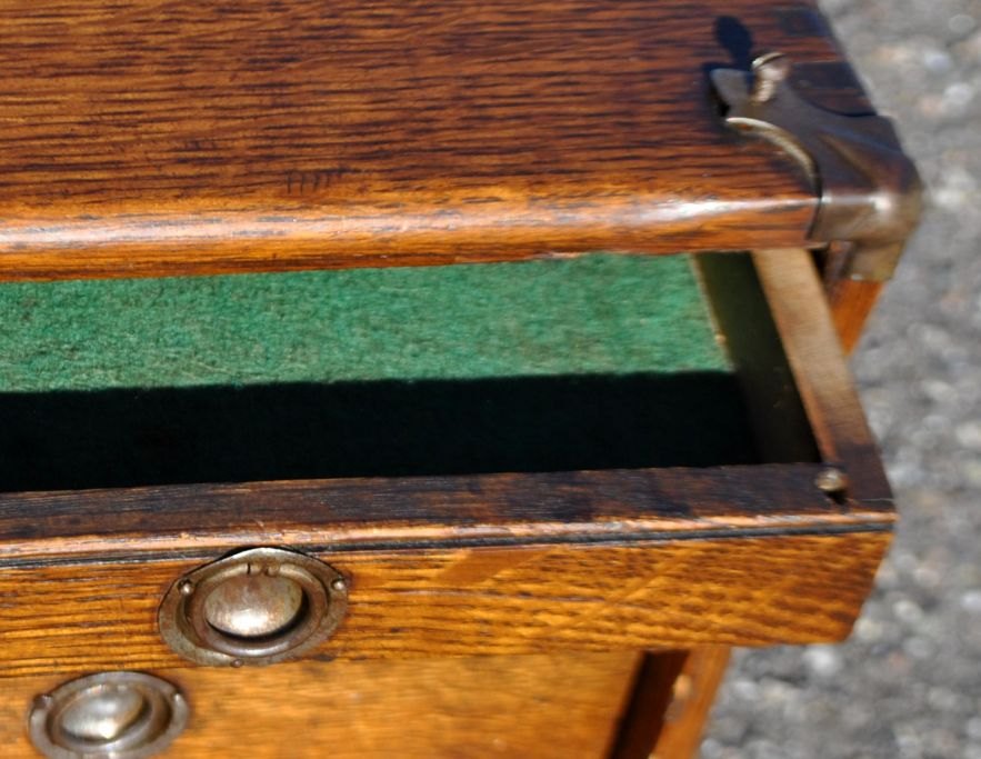 American tool box in polished oak, New York, 1922. Union Tade Mark Tools Chest Co. Inc. Rochester. New York, USA. Inside with 6 drawers covered with green felt. Leather handles. With label. Inside signed in pencil: CF Studier, New York 1922. With lid and removable front. H.: 28 cm. D.: 20 cm. W.: 43 cm.Item number: 28344