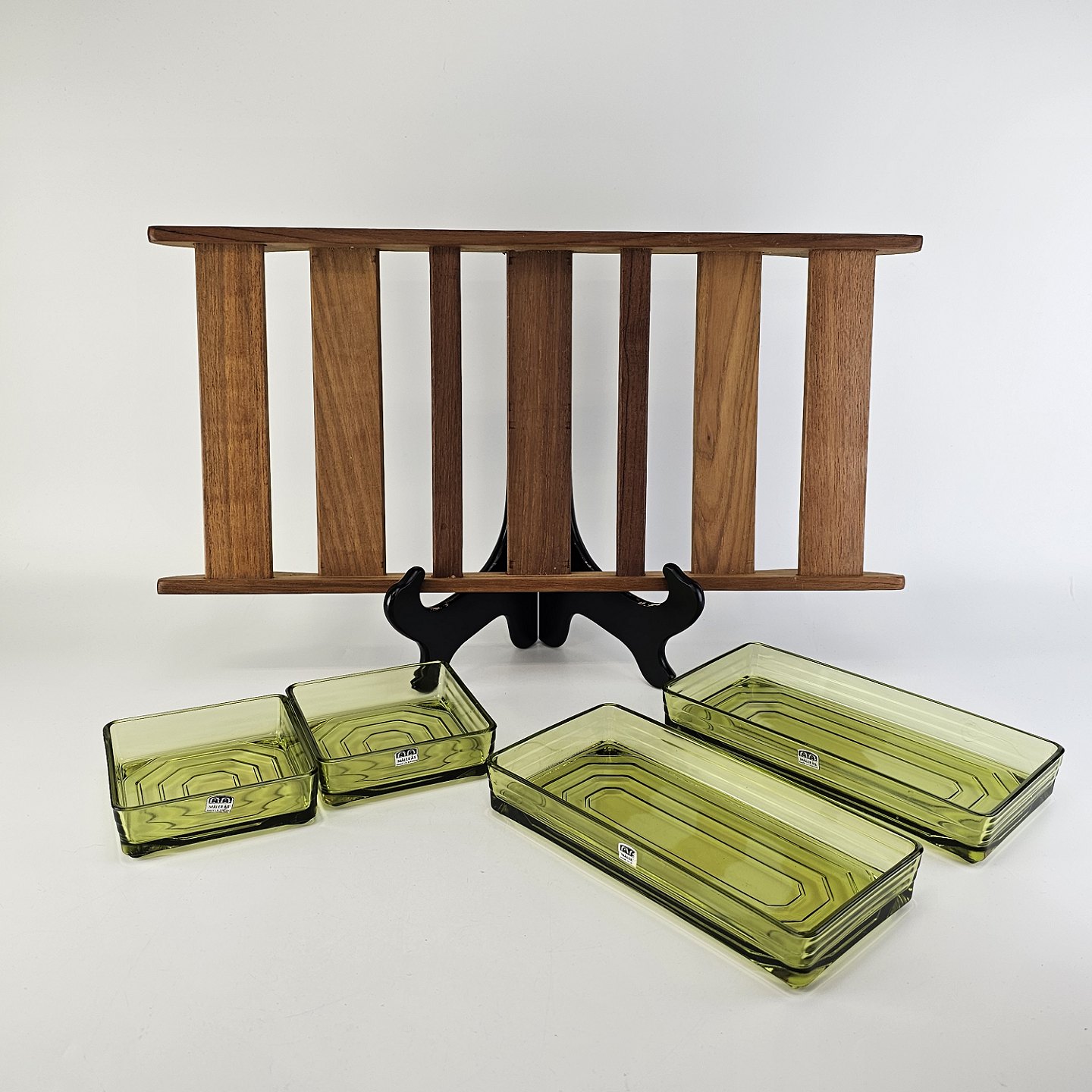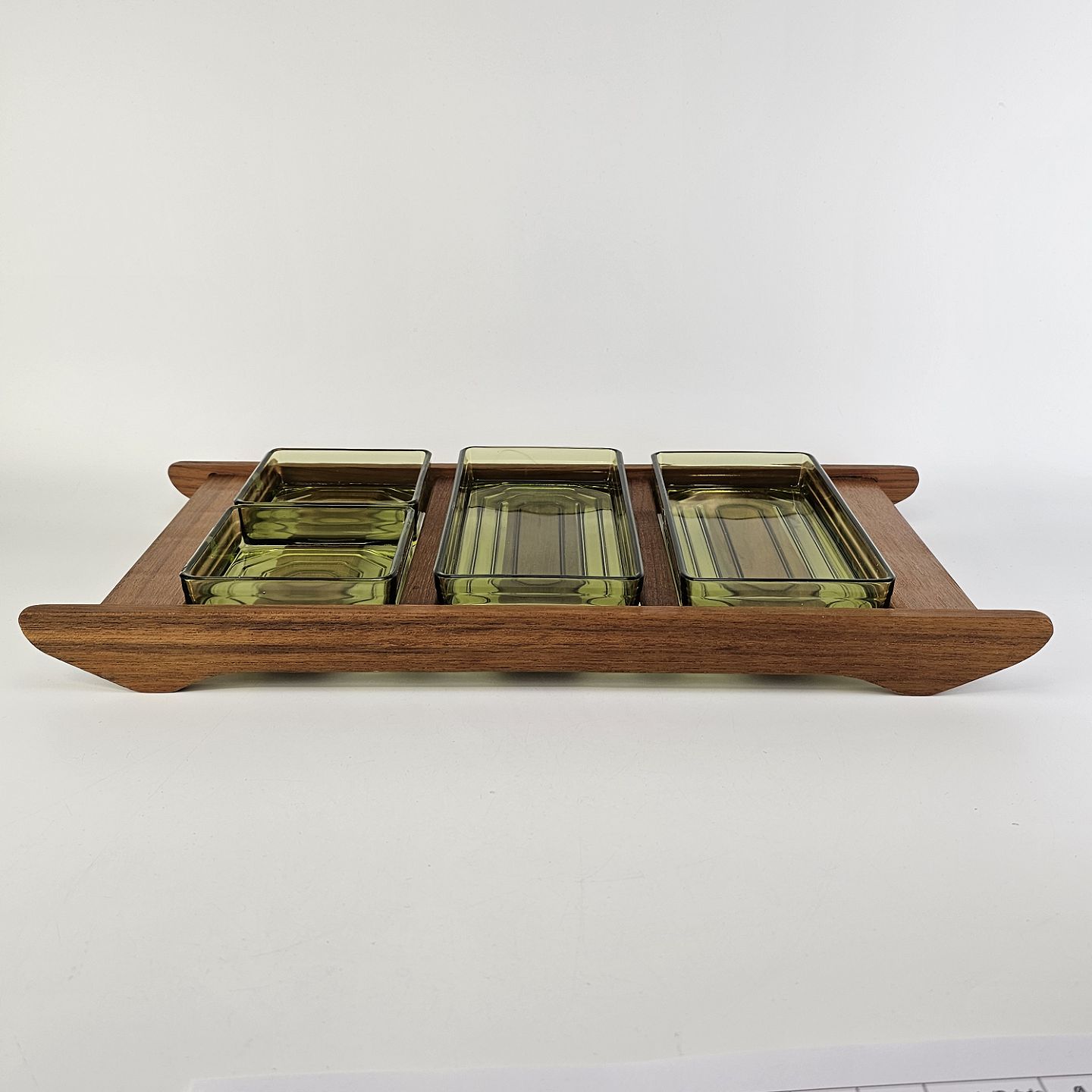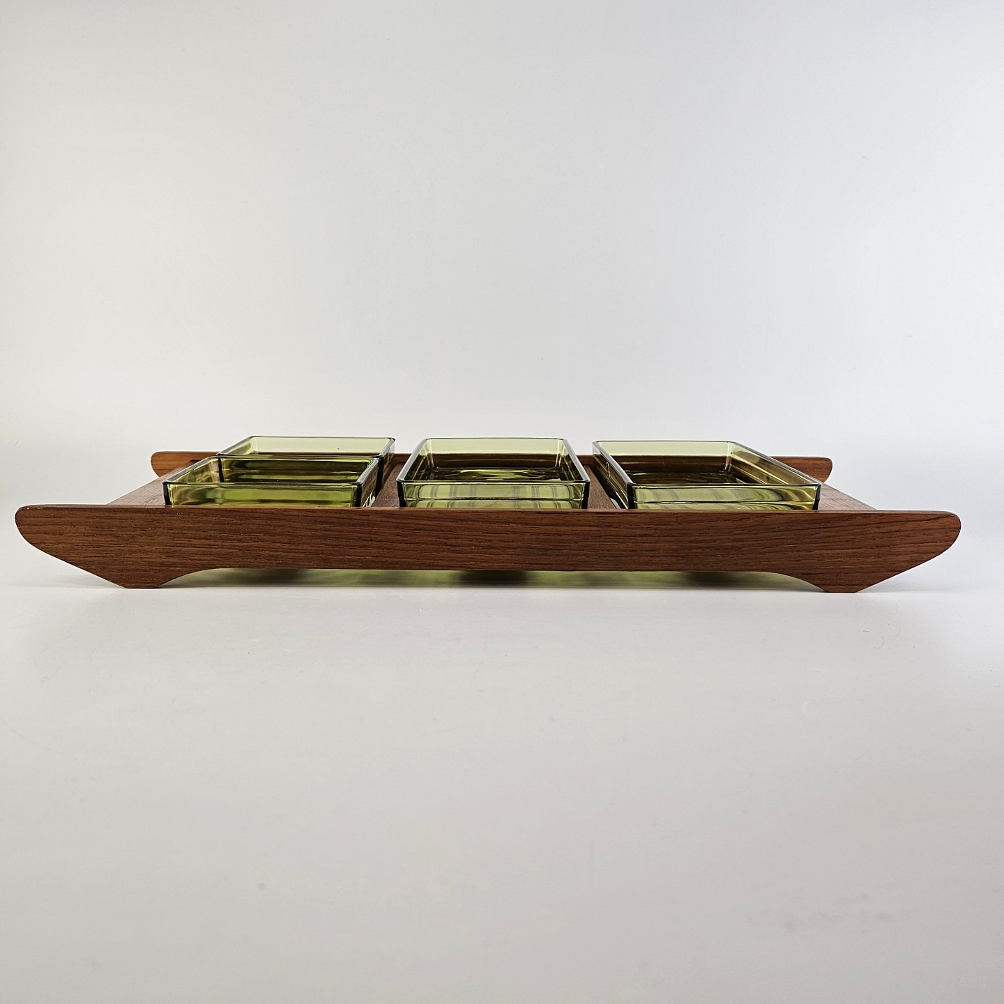 Cabaret fad i teaktræ med fire skåle af grønt presset glas i to forskellige størrelserProducent Målerås, made in Sweden