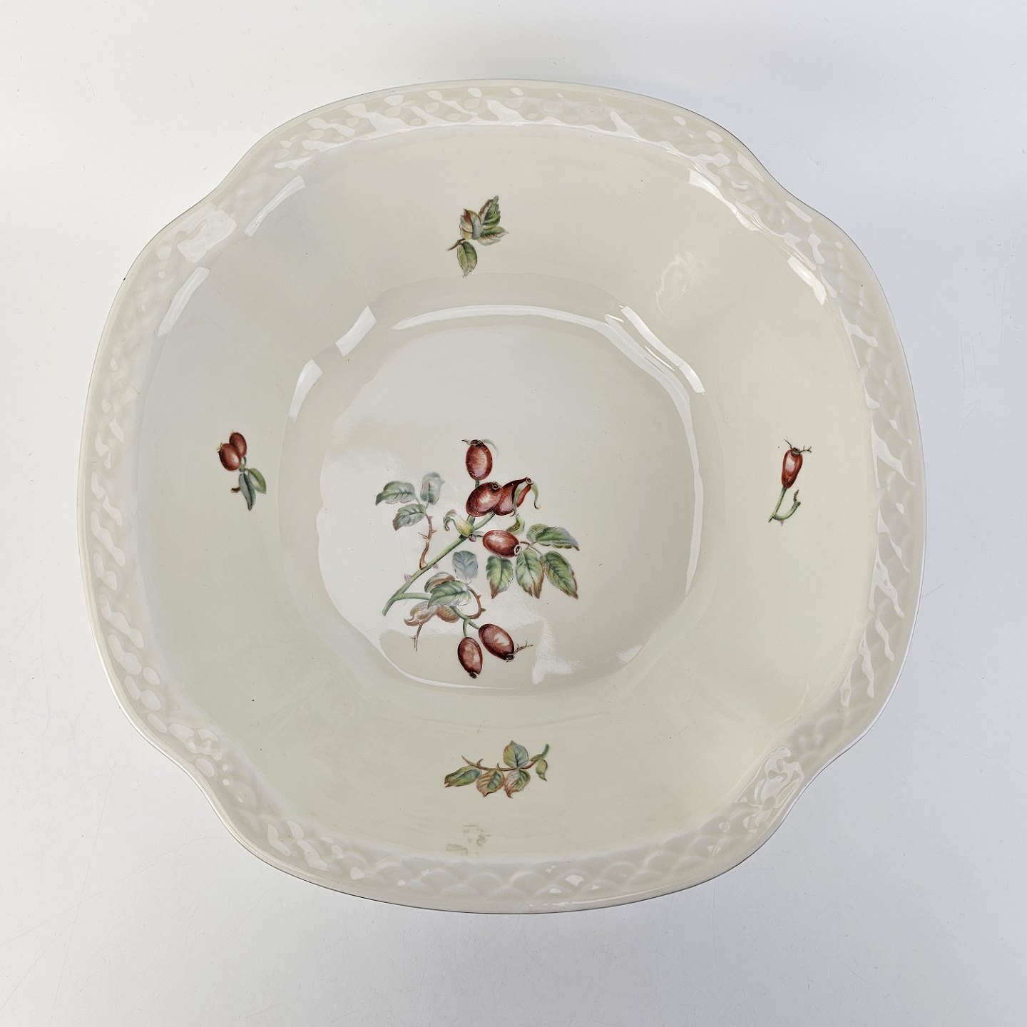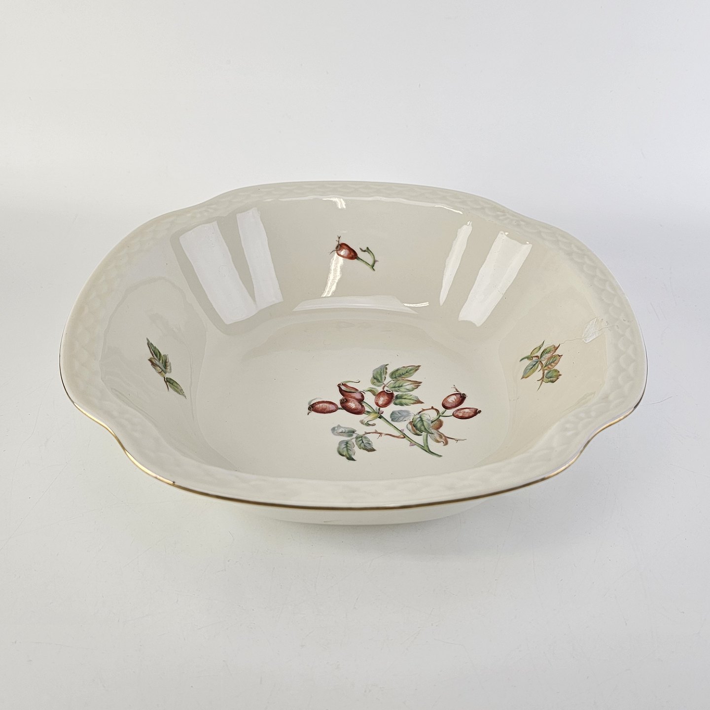 Balder er cremefarvet porcelæn i skælform, dekoreret med hyben og en guldkant.