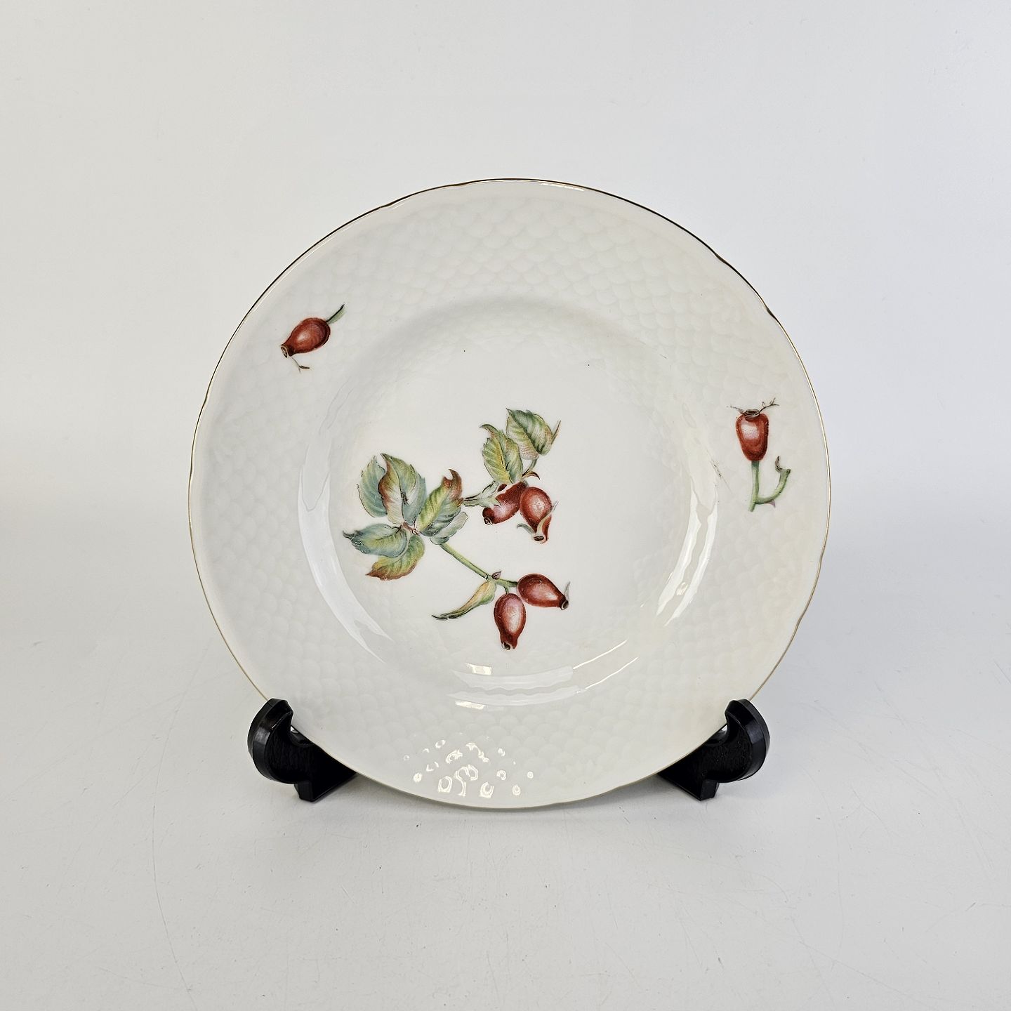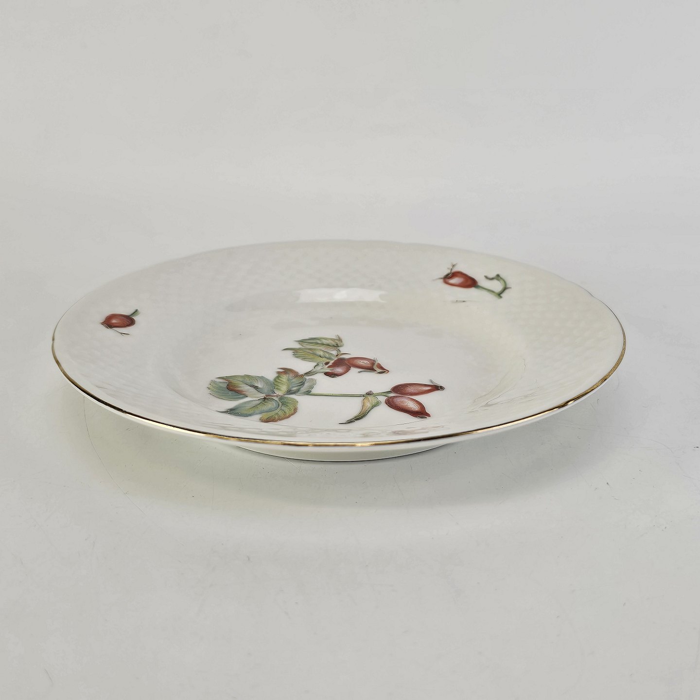 Balder er cremefarvet porcelæn i skælform, dekoreret med hyben og guldkant.