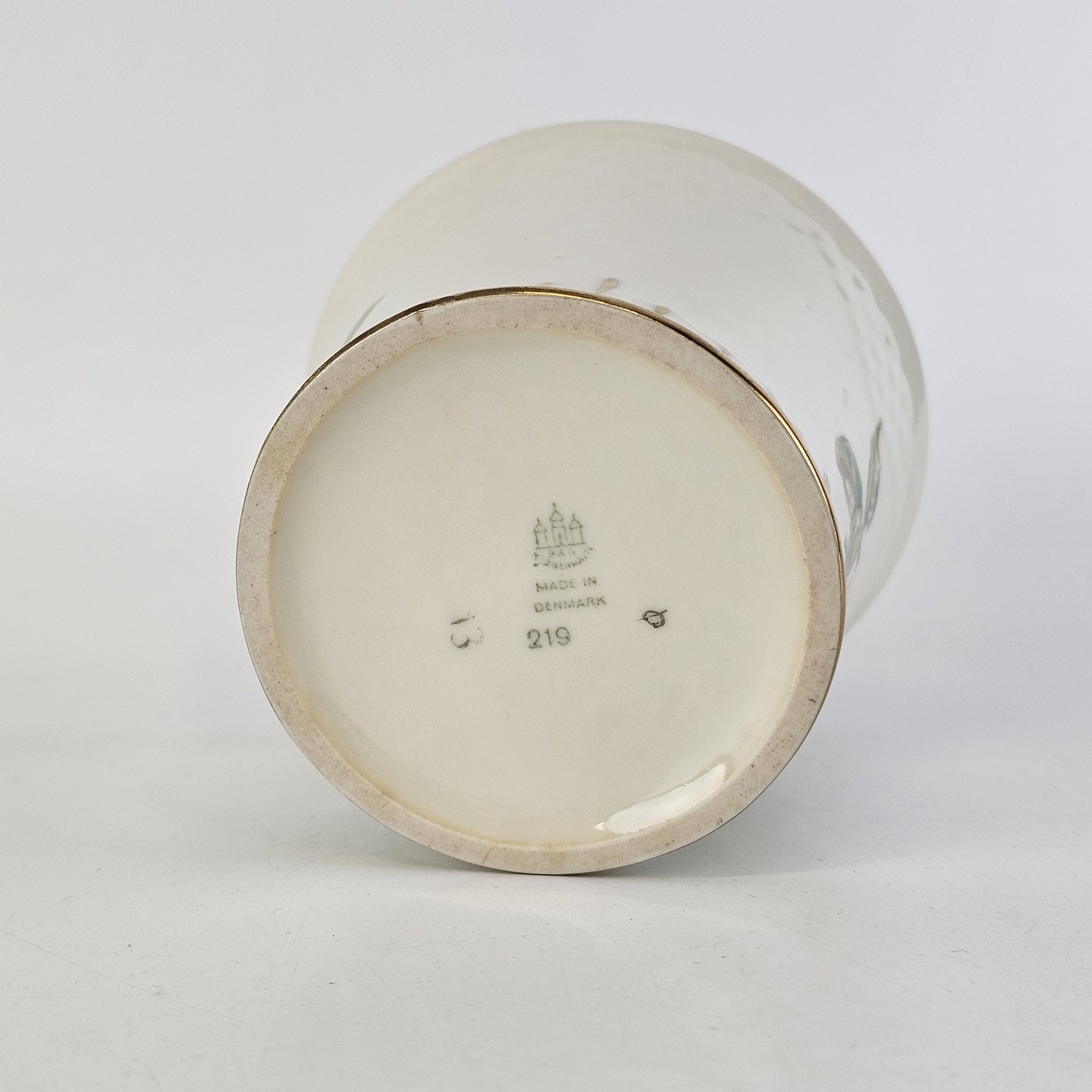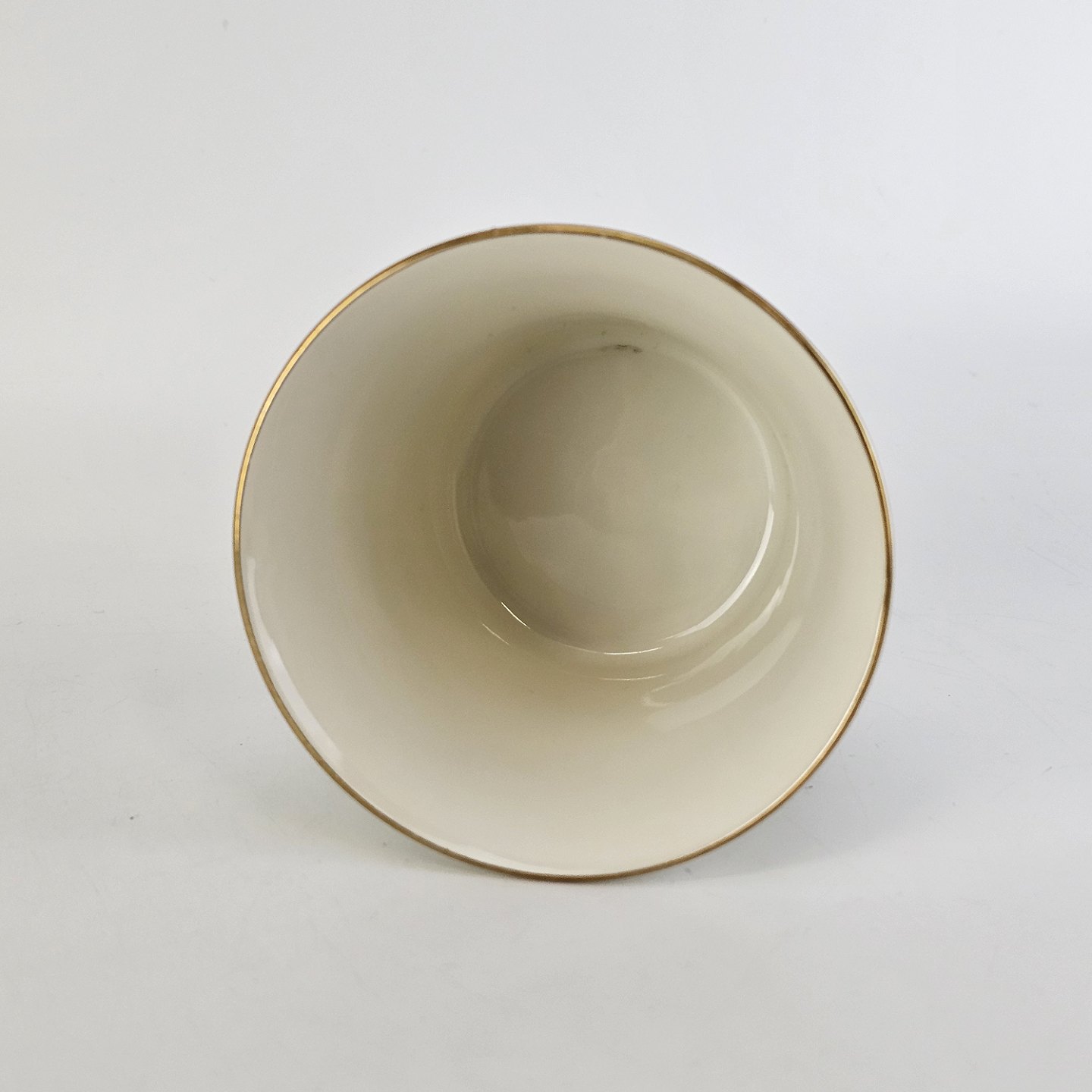Balder er cremefarvet porcelæn i skælform, dekoreret med hyben og guldkant.