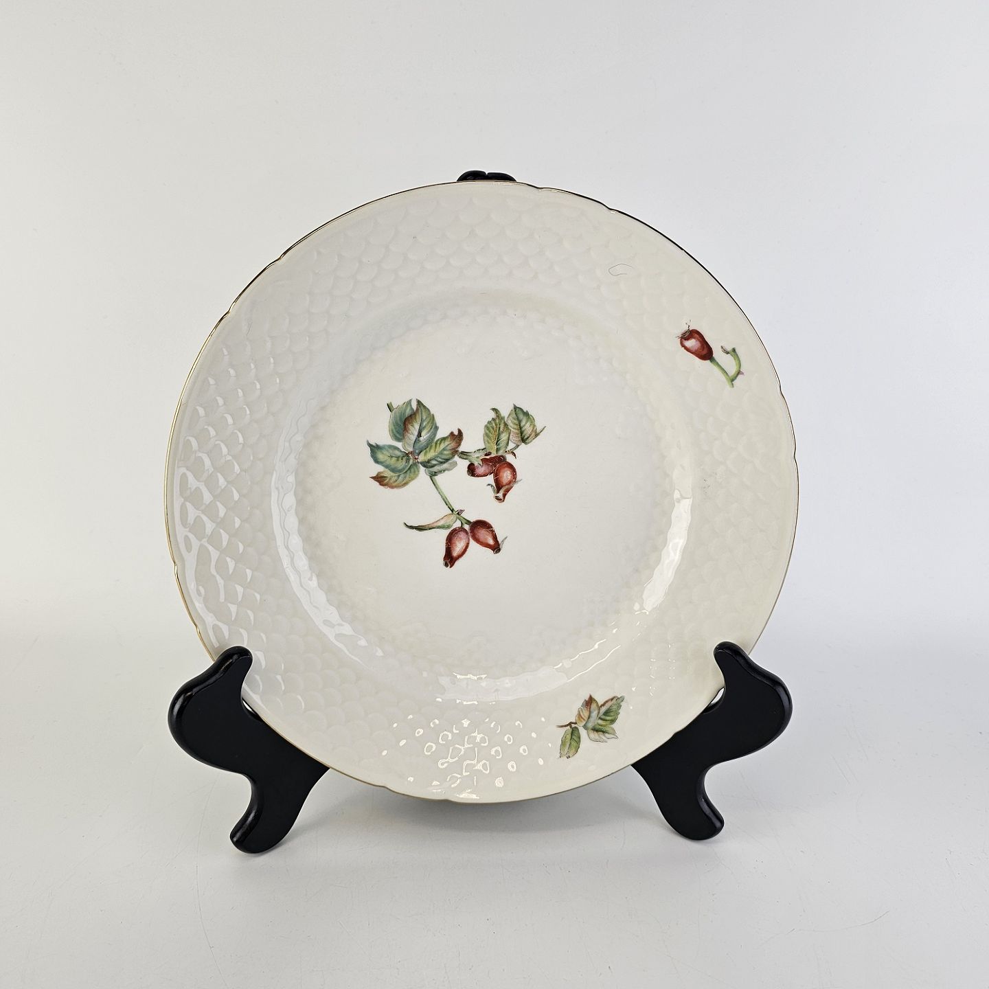 Balder er cremefarvet porcelæn i skælform, dekoreret med hyben og guldkant.