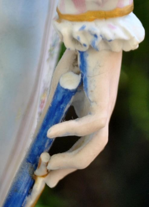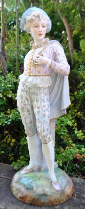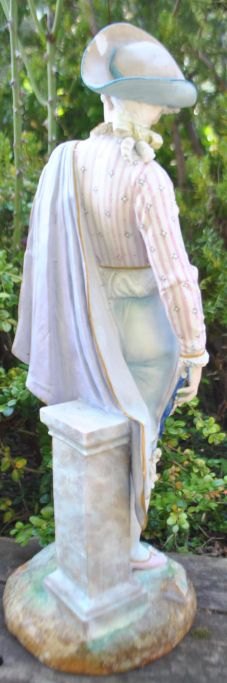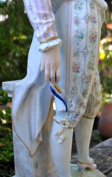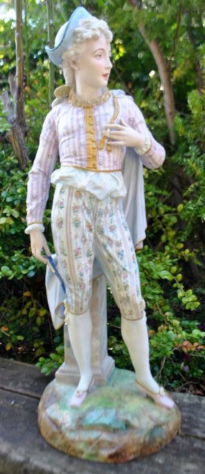 Large bisque figurine of a young man, 19th century. Armand Marseilles, Germany. Cold-painted porcelain and gilded. Stamped. H: 55.5 cm.NB: chip on back of hat and bow and arrow broken.