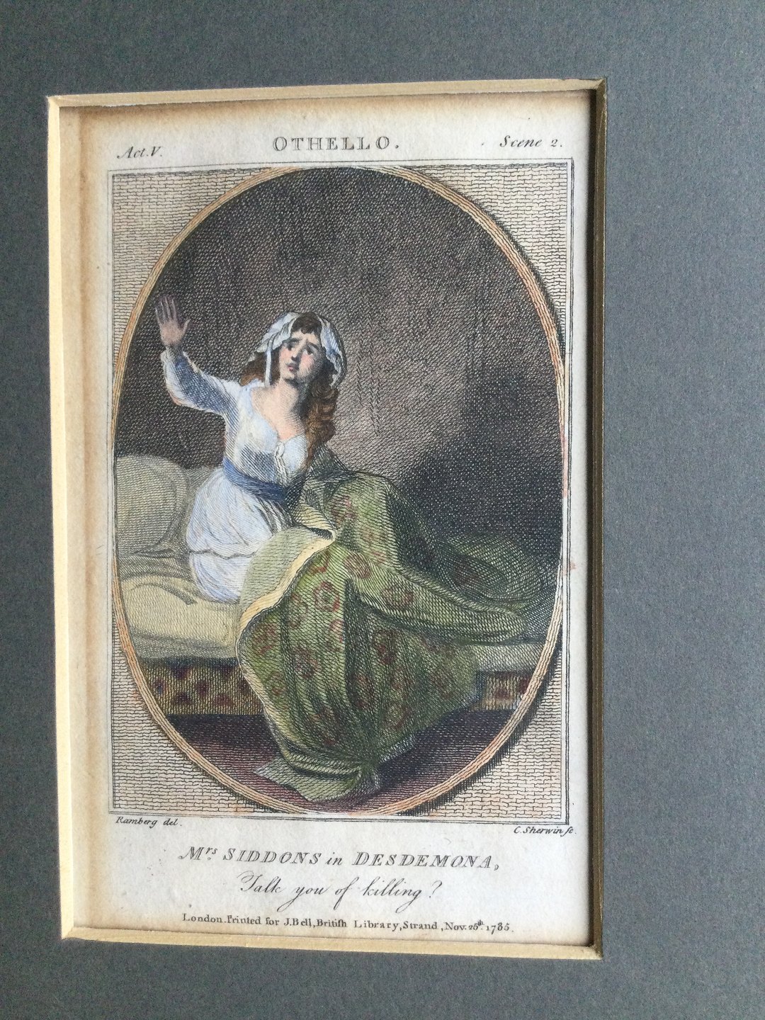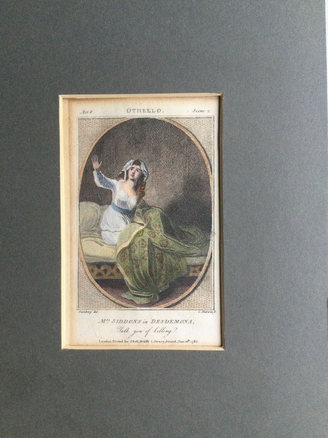Koloreret kobberstik af Charles Sherwin - Mrs Siddons som Desdemona i Othello 1785.