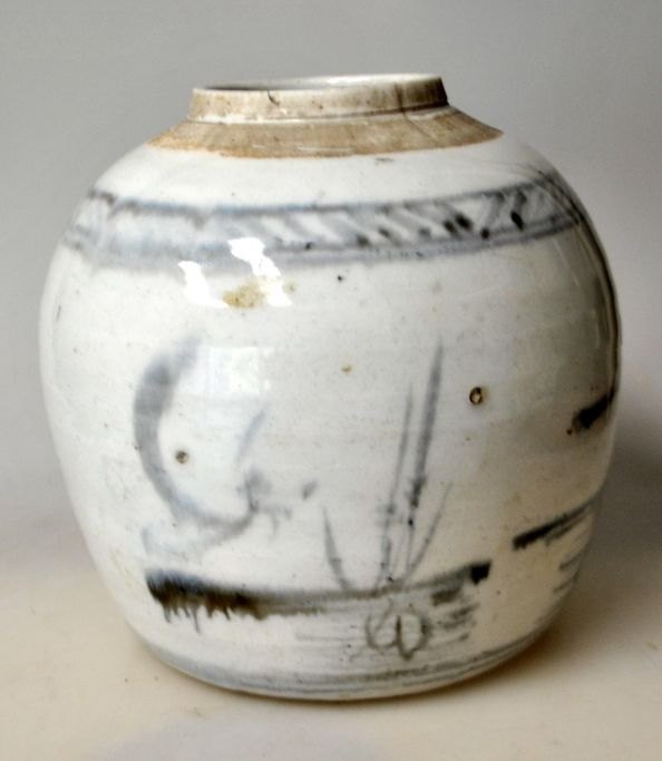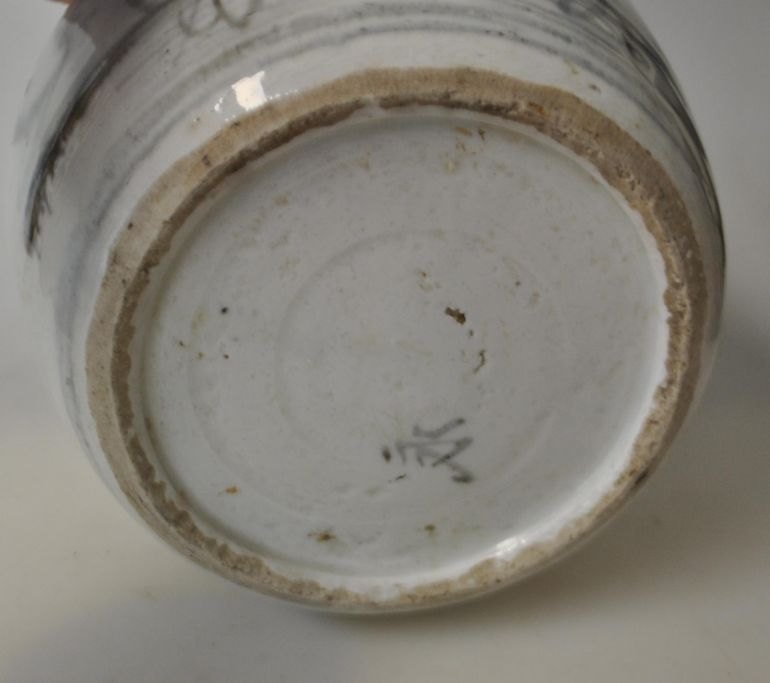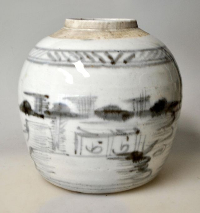 Chinese bojan, 19th century. Gray porcelain with blue/gray paint. Decorations in the form of landscapes. Without lid. Stamped. H.: 15.5 cm. Dia.: 15.5 cm.NB: Small hairline crack at edge.