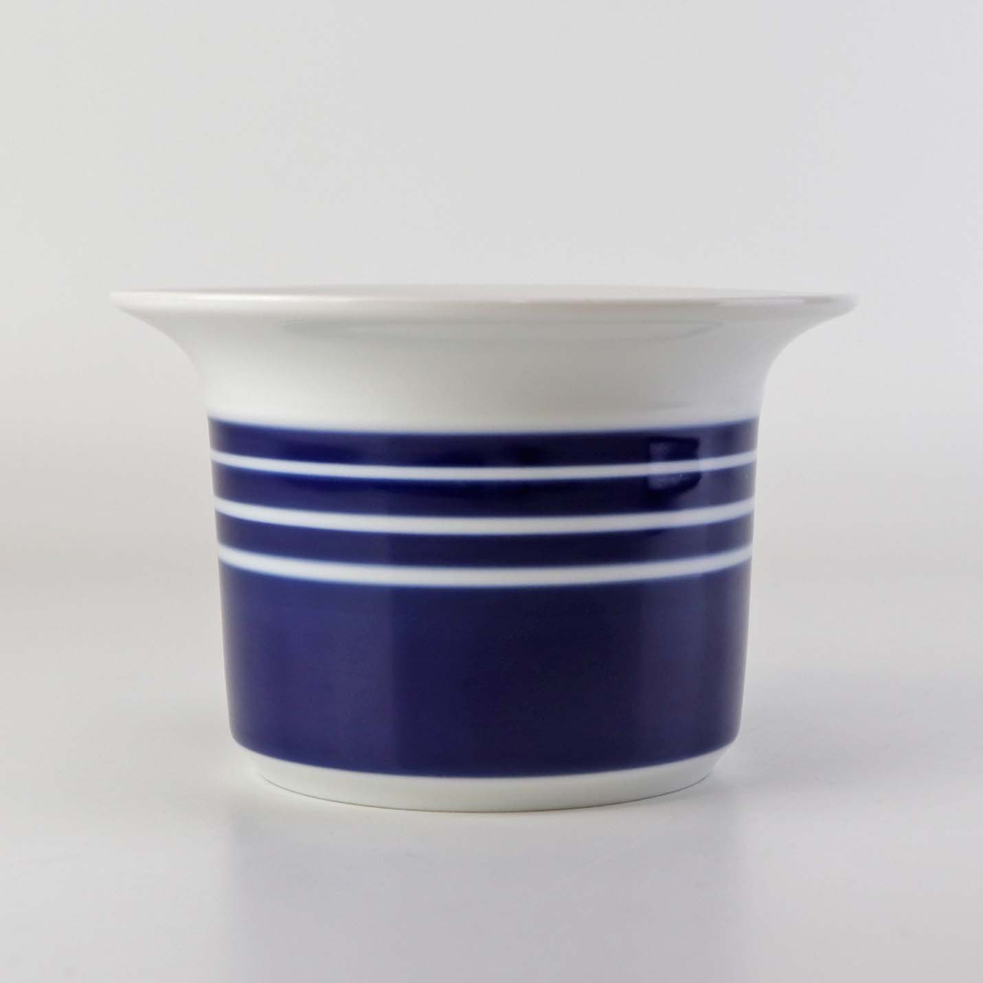 Lille urtepotteskjuler i glat hvidt porcelæn dekoreret med blå striber. Nr. 1855/6102Formgiver Edith Sonne