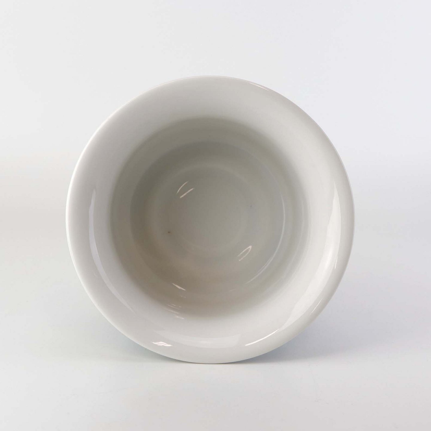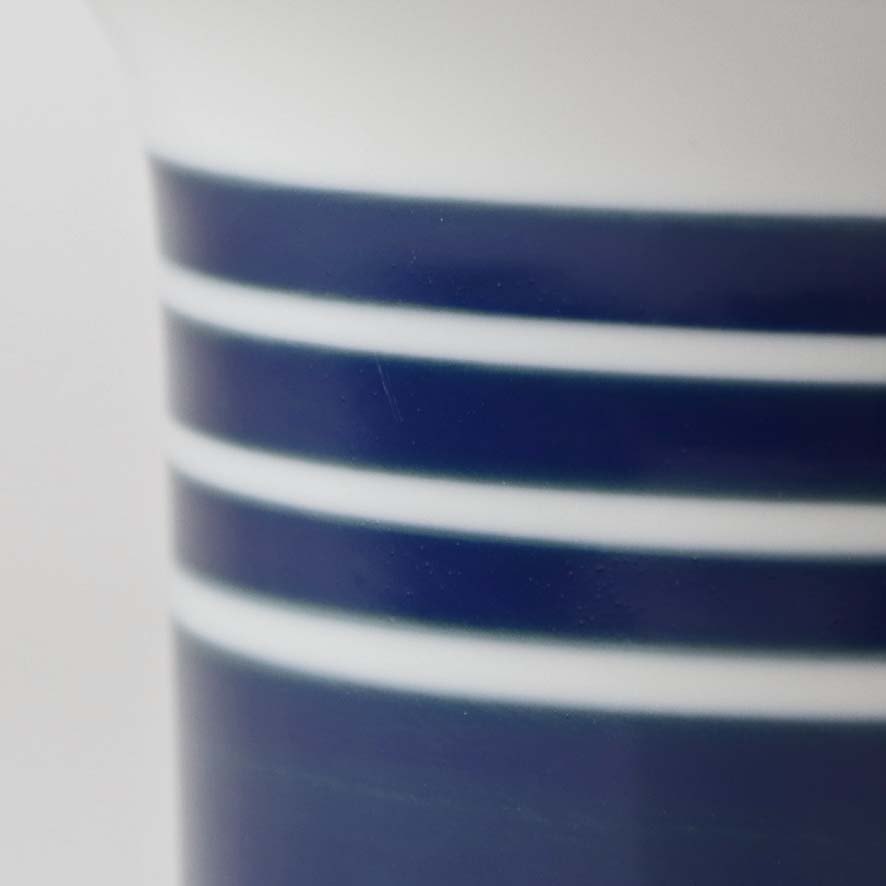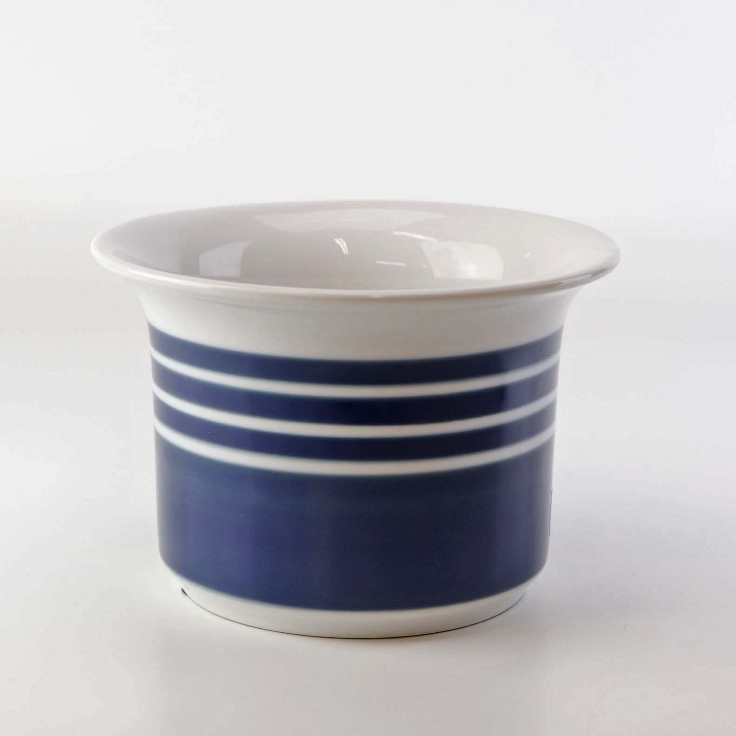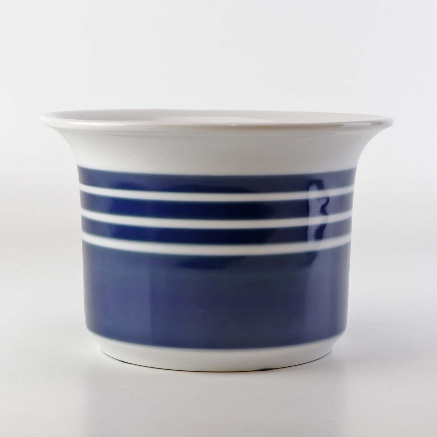 Mellemstørrelse urtepotteskjuler i glat hvidt porcelæn dekoreret med blå striber. Nr. 1855/6103Formgiver Edith Sonne