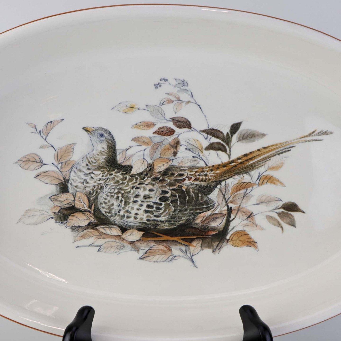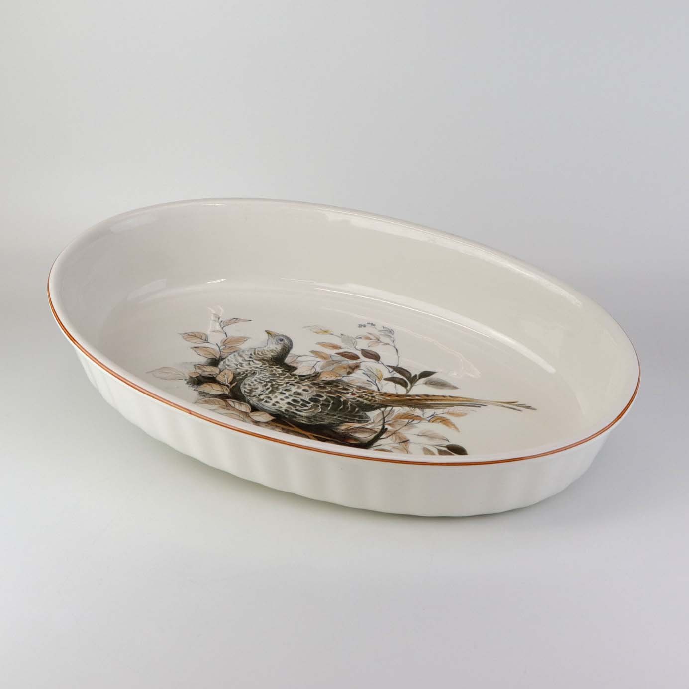 Ovalt ildfast fad i porcelæn med motiv af agerhøne på rede fra stellet Jagtstel. Nr. 2Formgiver Mads Stage