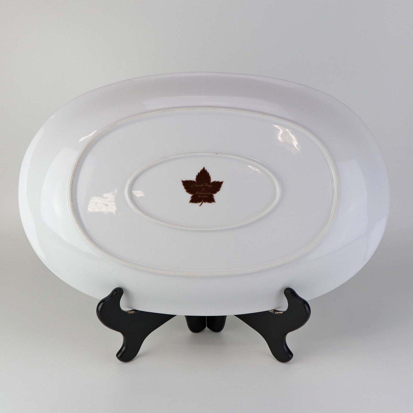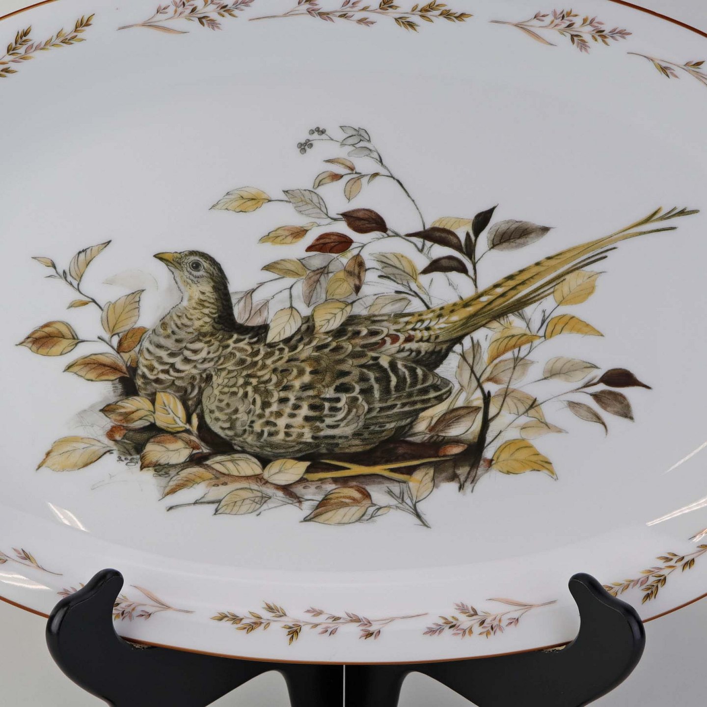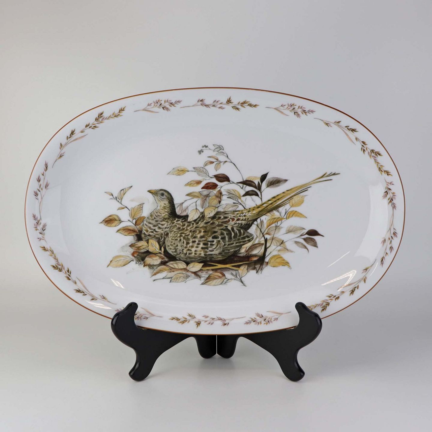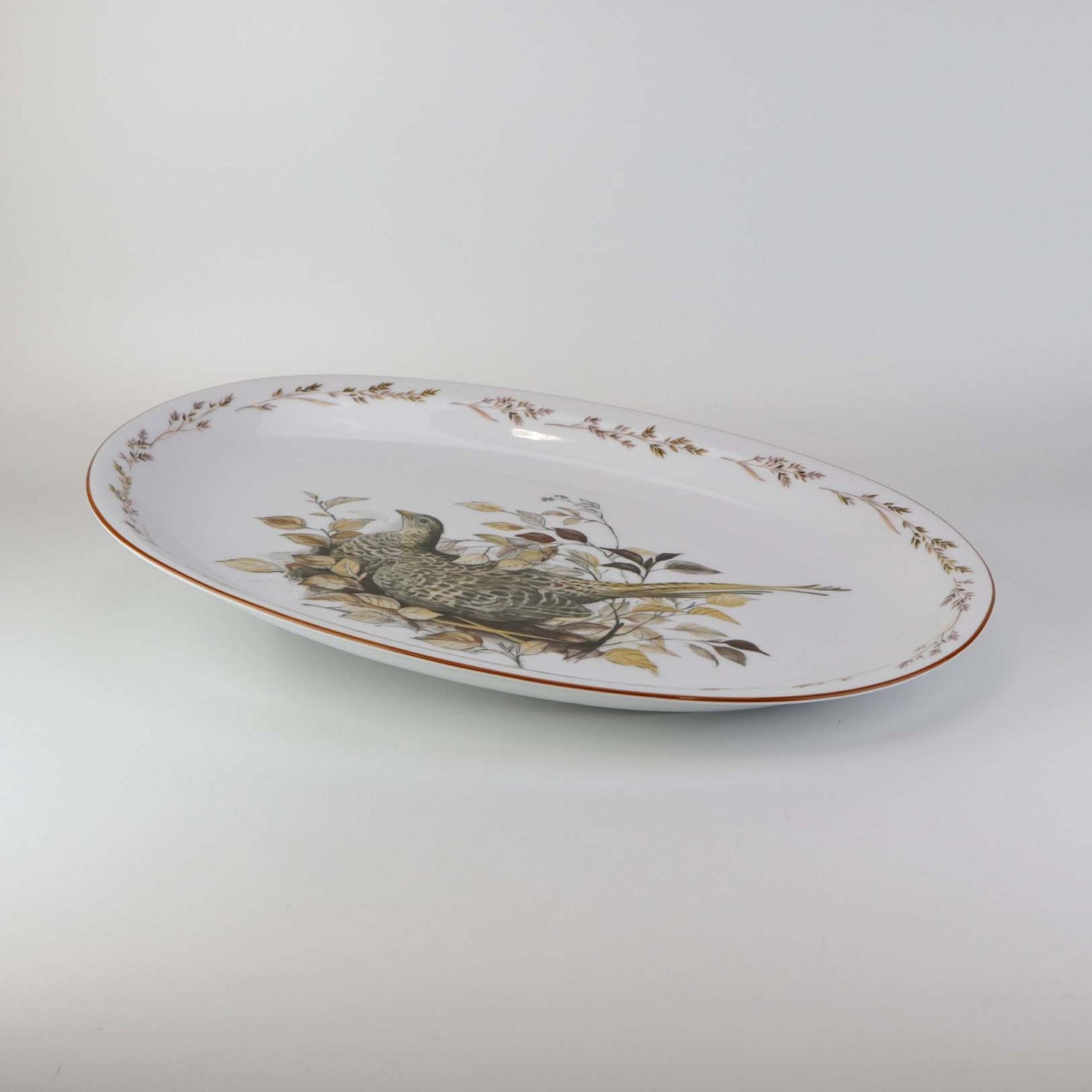 Ovalt serveringsfad i porcelæn med motiv af agerhøne på rede fra stellet Jagtstel. Nr. 38Formgiver Mads Stage