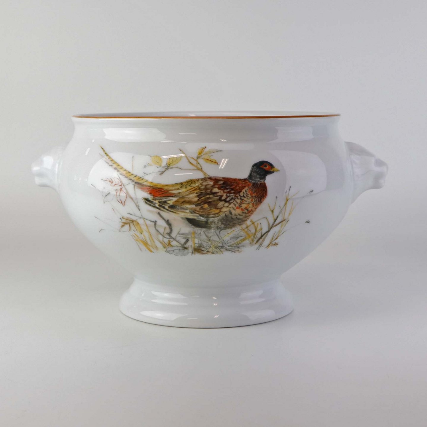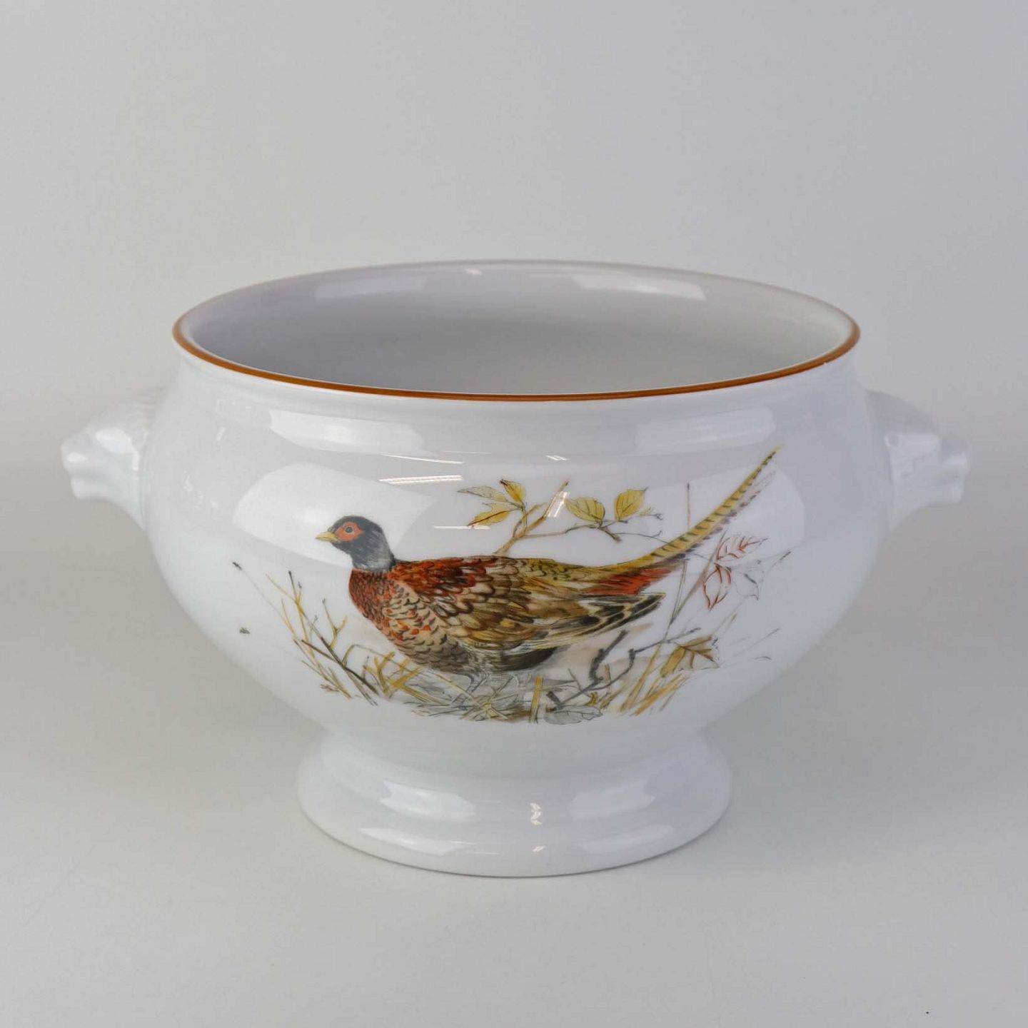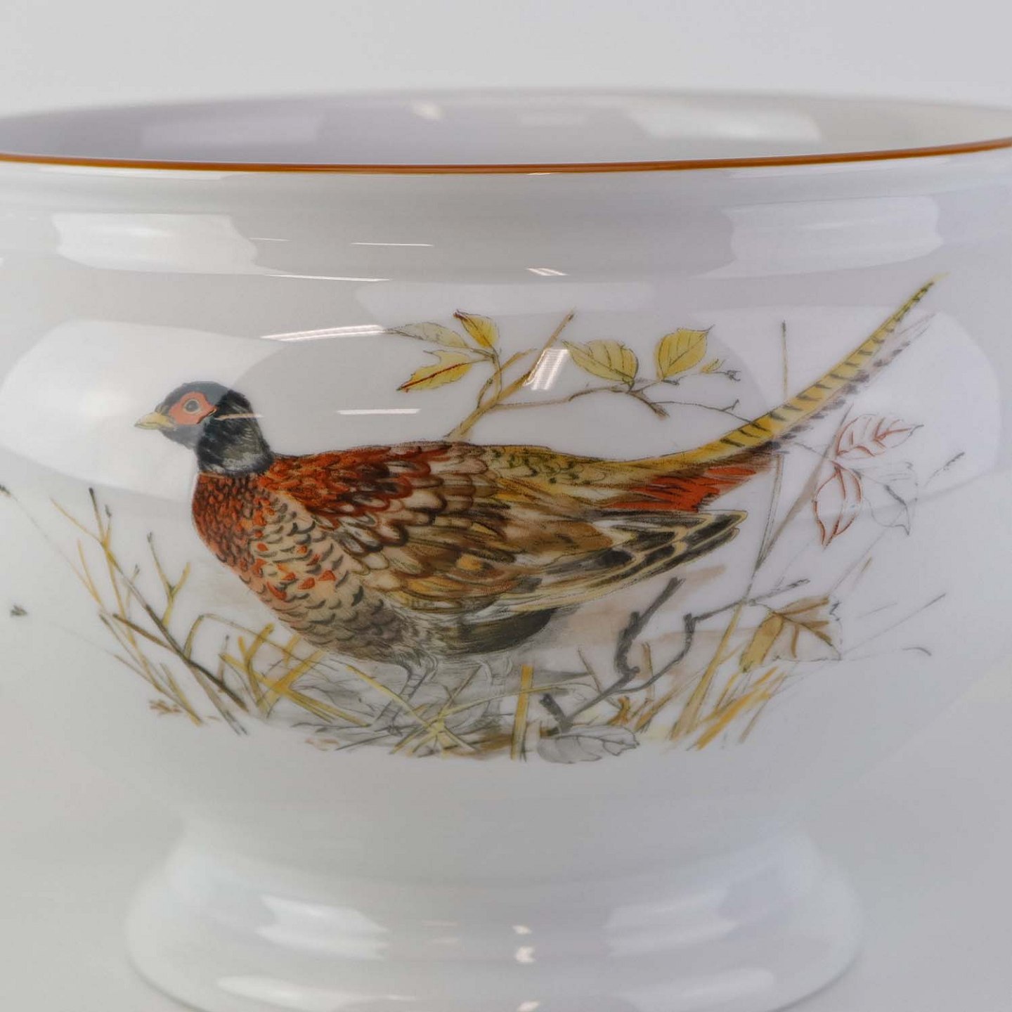 Rund skål på fod i porcelæn med hanke af grævlingehoveder og med motiv af fasan fra stellet Jagtstel. Nr. 2Formgiver Mads Stage
