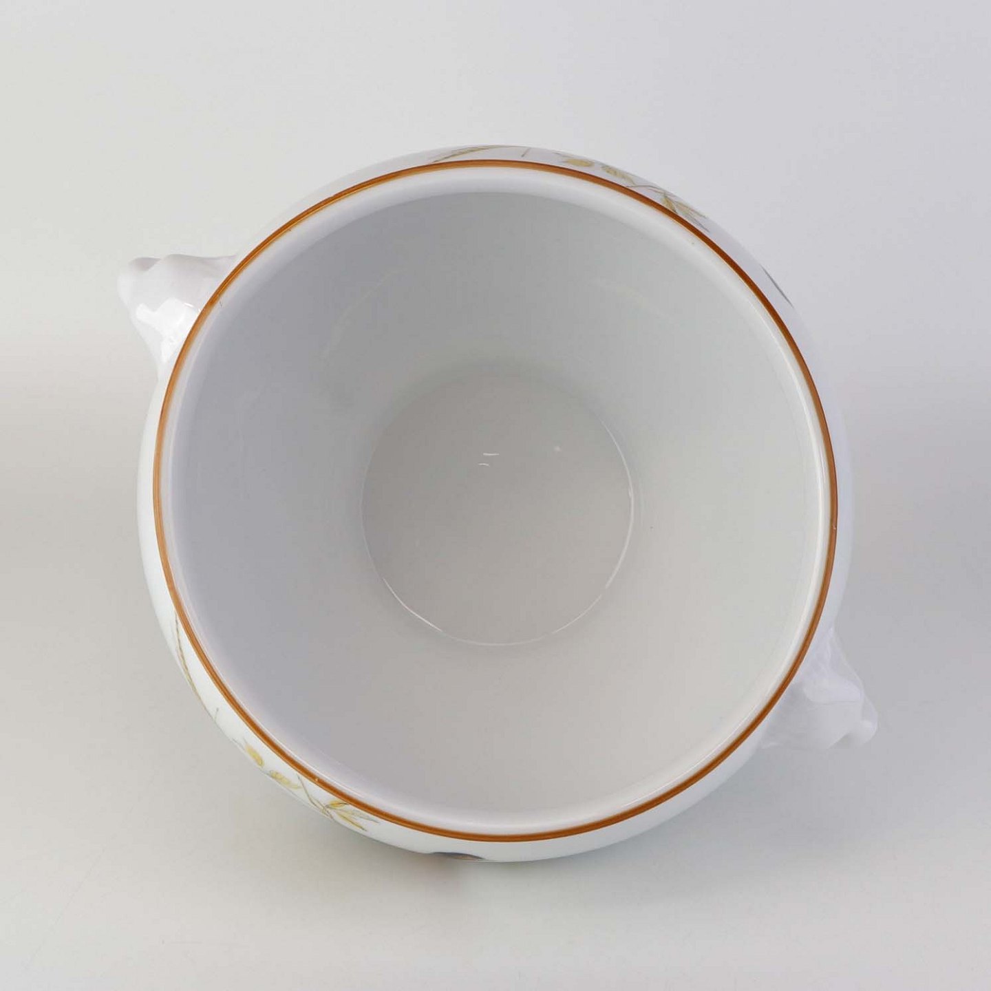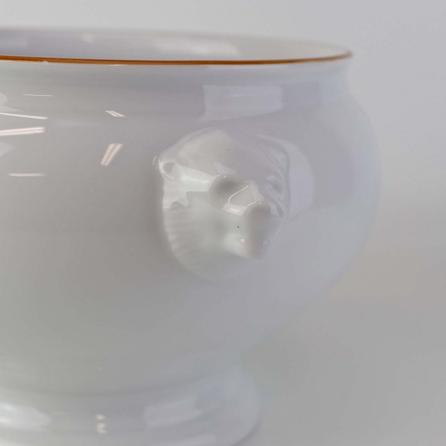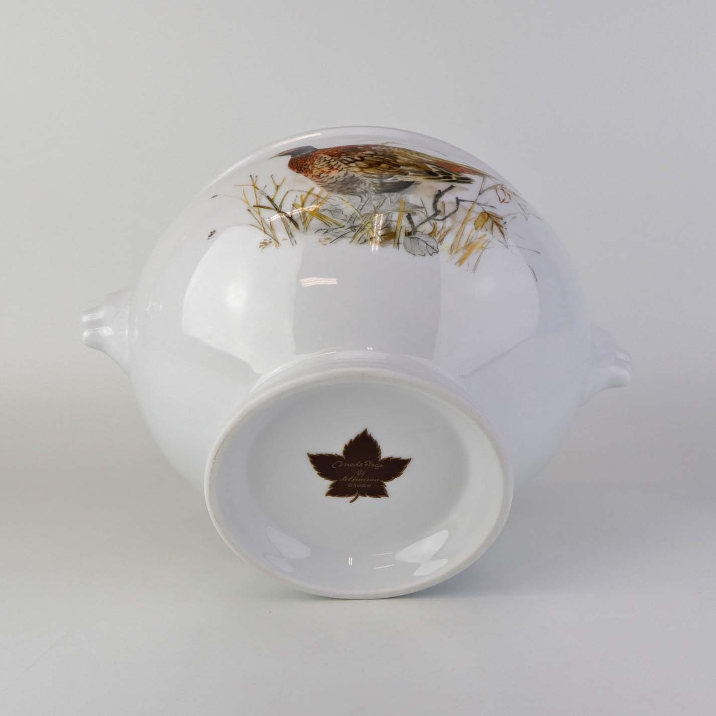 Rund skål på fod i porcelæn med hanke af grævlingehoveder og med motiv af fasan fra stellet Jagtstel. Nr. 2Formgiver Mads Stage