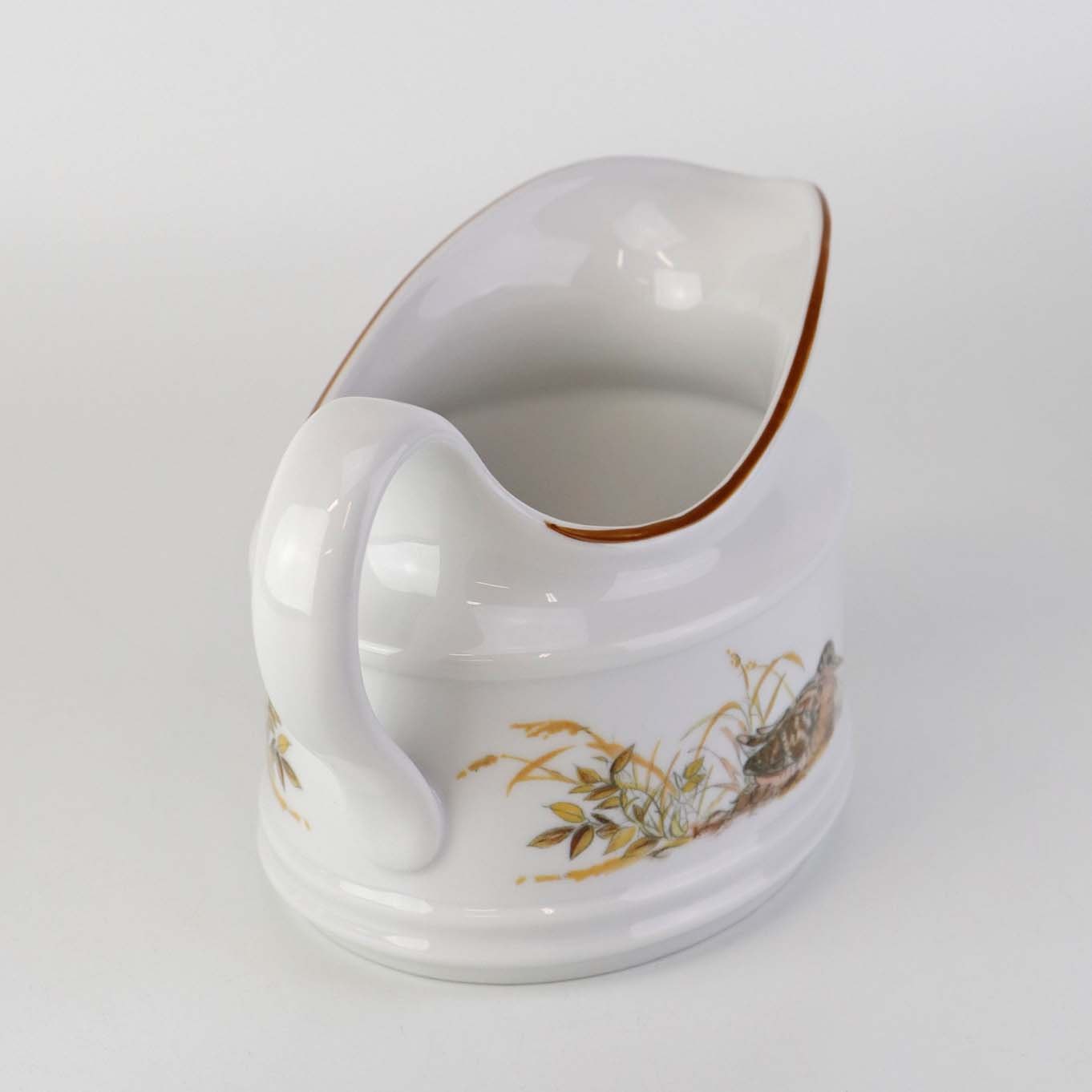 Jagtstellet er i glat hvidt porcelæn med gyldenbrun kantdekoration og motiver af forskellige vilde danske dyr i deres naturlige miljø. Stellet er holdt i dæmpede varme efterårsfarver.