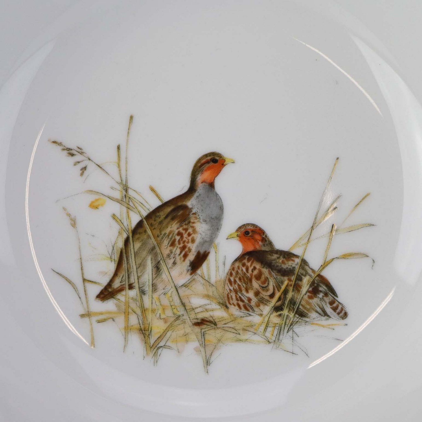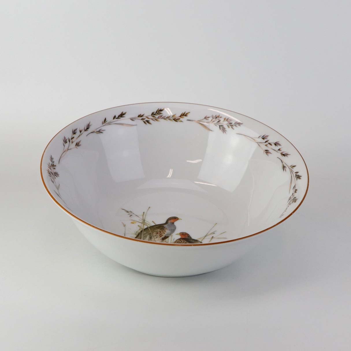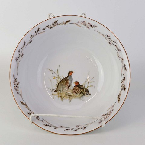 Rund skål til kartofler i porcelæn med motiv af agerhøns fra stellet Jagtstel. Formgiver Mads Stage