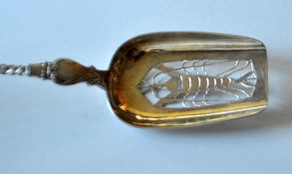 Silver crab spoon, Copenhagen, 1869. Unidentifiable master's mark. With city coat of arms and guardein mark. Handle with crab and interior gilding. Twisted handle with angel head. L: 22 cm.Item number: 28110