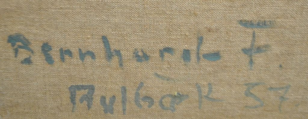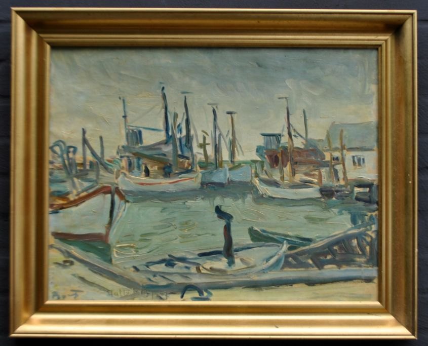Bernhardt-Frederiksen, Aage (1883 - 1963) Denmark: The harbor in Aalbæk. Oil on canvas. Signed on 19.9.1957. 44 x 60 cm.Verso signed.