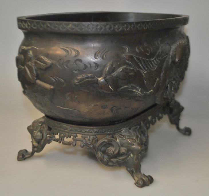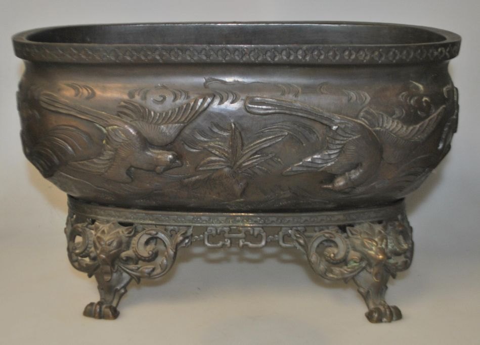 Large Chinese bronze flower jardiniere, 19th century. On four lion feet. With edge decorations. Sides decorated with large dragon and birds. L.: 32 cm. W.: 19 cm. H: 18 cm.Perfect condition!
