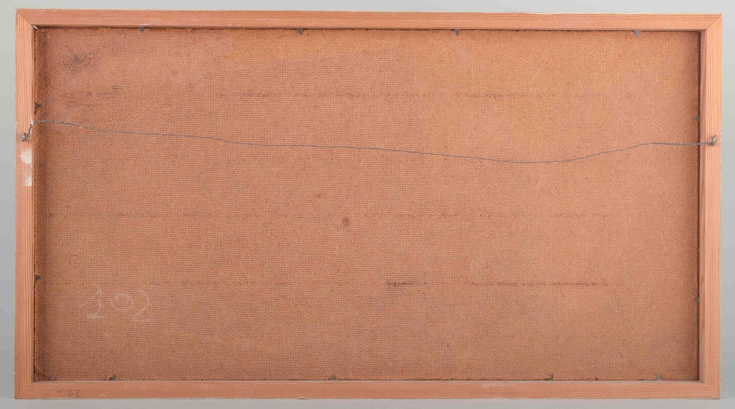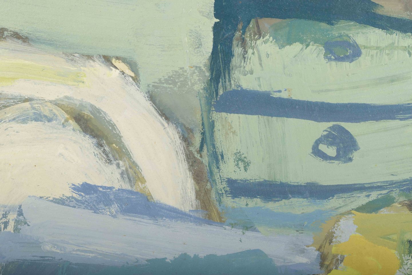 An atmospheric abstract still life, where geometric and soft forms in blue, green, and yellow hues create a harmonious and lyrical composition. The motif suggests an interior with flowers and objects, interpreted through loose and expressive brushwork typical of the period.