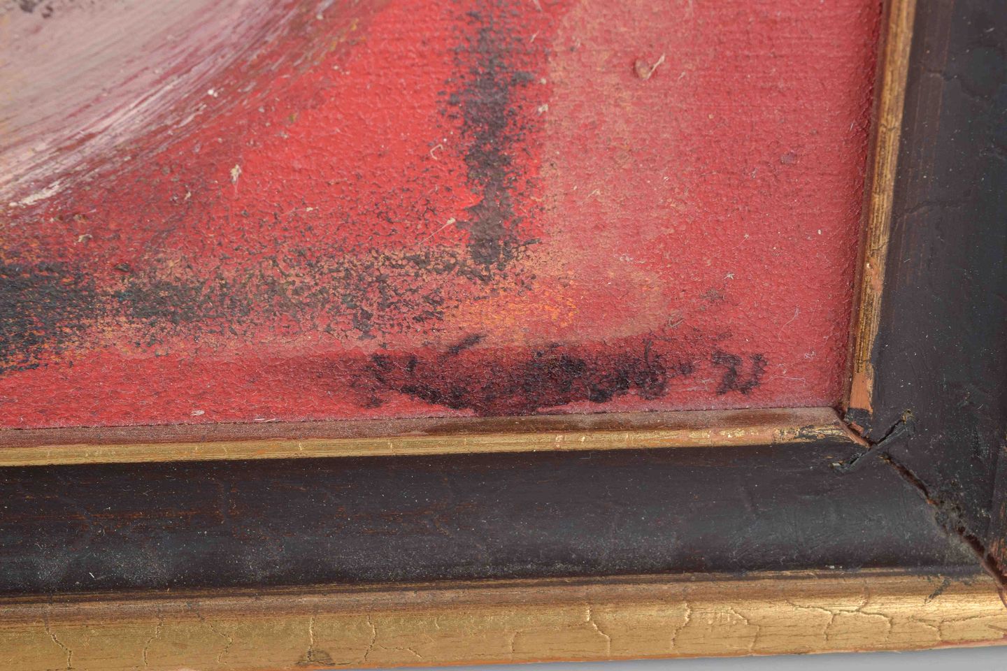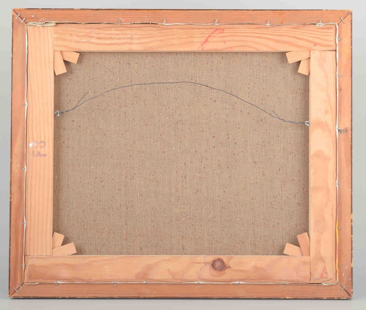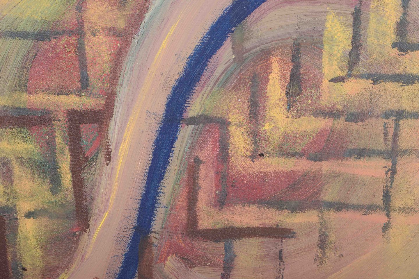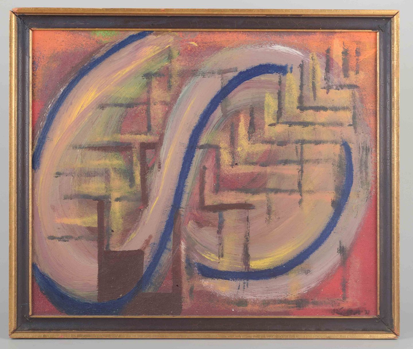 A colorful and geometric-abstract painting, where organic and linear forms intersect in a play of blue, yellow, and reddish tones. The central undulating shape divides the surface and creates a rhythmic contrast to the background’s network of angular structures.